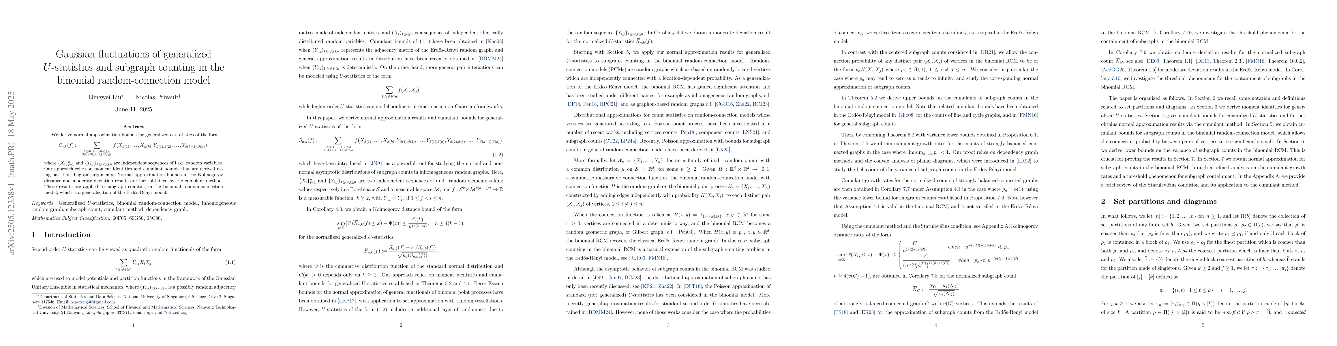 The research derives normal approximation bounds for generalized $U$-statistics using moment identities and cumulant bounds obtained via partition diagram arguments. It then applies these bounds to subgraph counting in the binomial random-connection model, a generalization of the Erdős-Rényi model.