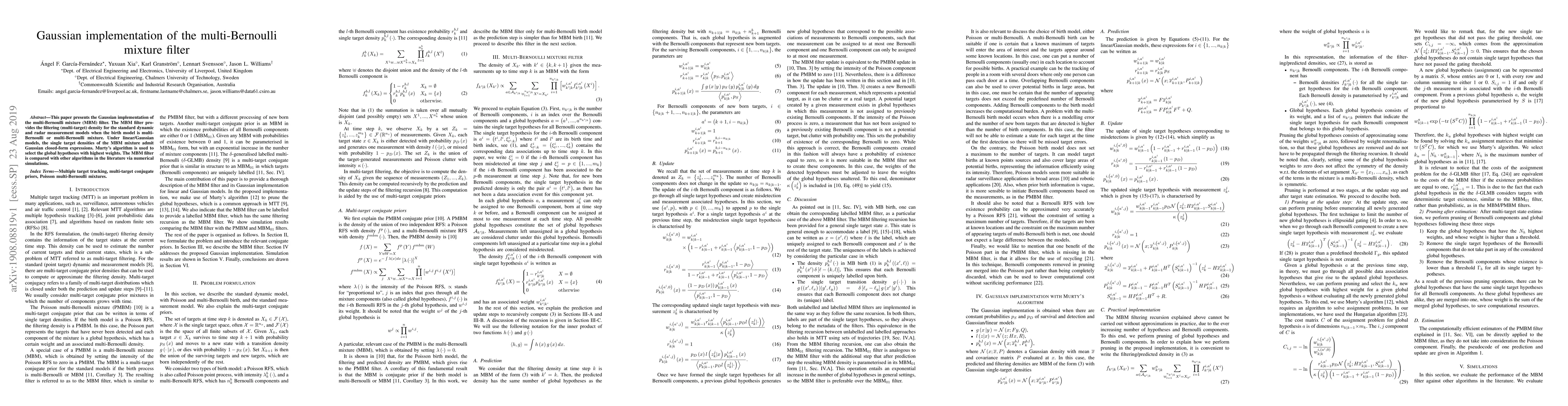 The paper presents a Gaussian implementation of the Multi-Bernoulli Mixture (MBM) filter, which provides the filtering density for multi-target tracking under specific birth and measurement models. It uses Murty's algorithm for global hypothesis pruning.