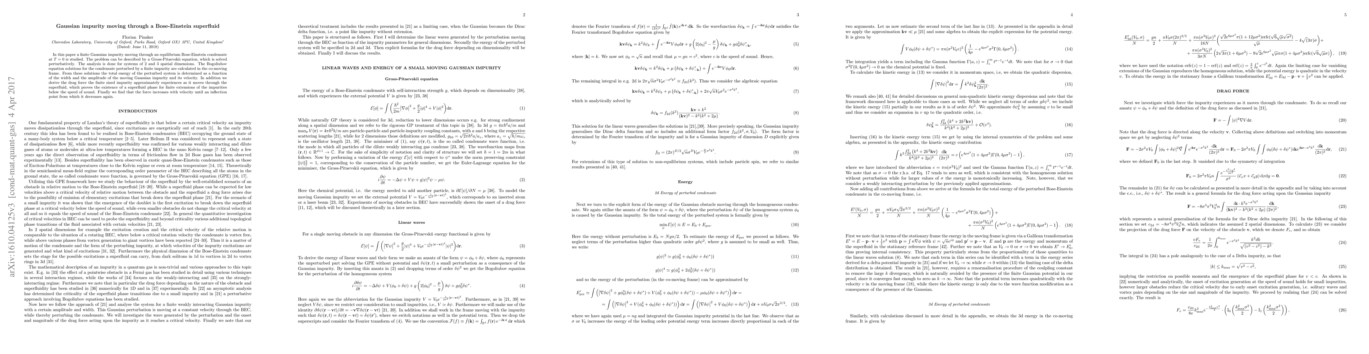 In this paper a Gaussian impurity moving through an equilibrium Bose-Einstein condensate at T = 0 is studied. The problem can be described by a Gross-Pitaevskii equation, which is solved perturbatively. The analysis is done for systems of 2 and 3 spatial dimensions and generalises the work by [G.E. Astrakharchik and L.P. Pitaevskii, Phys. Rev. A 70, 013608 (2004)]. The Bogoliubov equation solutions for the condensate perturbed by a finite impurity are calculated in the co-moving frame, which are formally equivalent up to a dimension dependent form factor for general dimensions. From those solutions the total energy of the perturbed system is determined as a function of the width and the amplitude of the moving Gaussian impurity and its velocity. Finally we derive the drag force the Gaussian impurity approximately experiences as it moves through the superfluid, which proofs the existence of a superfluid phase for finite extensions of the impurities below the speed of sound and that the force increases monotonically with velocity until it decreases again.