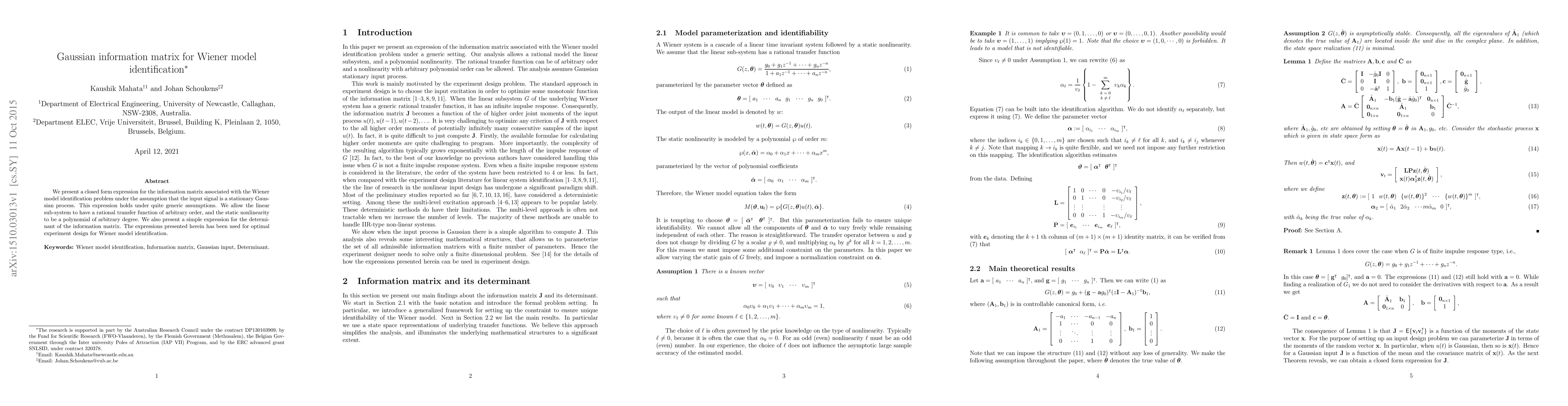 We present a closed form expression for the information matrix associated with the Wiener model identification problem under the assumption that the input signal is a stationary Gaussian process. This expression holds under quite generic assumptions. We allow the linear sub-system to have a rational transfer function of arbitrary order, and the static nonlinearity to be a polynomial of arbitrary degree. We also present a simple expression for the determinant of the information matrix. The expressions presented herein has been used for optimal experiment design for Wiener model identification.