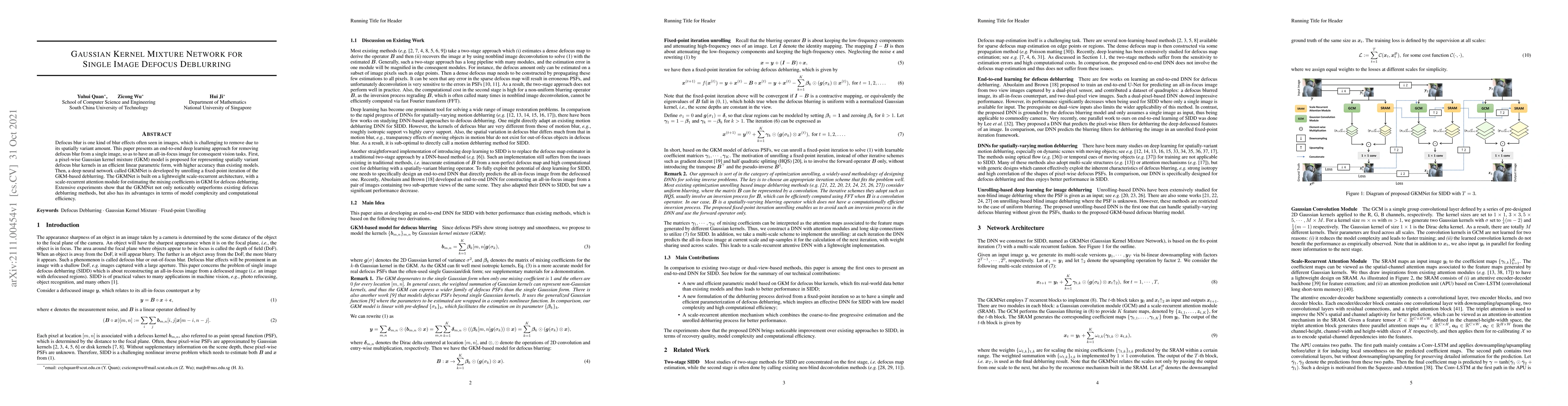 This paper proposes a Gaussian Kernel Mixture Network (GKMNet) for defocus blur removal in single images, utilizing a pixel-wise Gaussian kernel mixture model for efficient representation of spatially variant blur kernels. The GKMNet, built on a lightweight scale-recurrent architecture, outperforms existing methods in deblurring accuracy while maintaining computational efficiency.