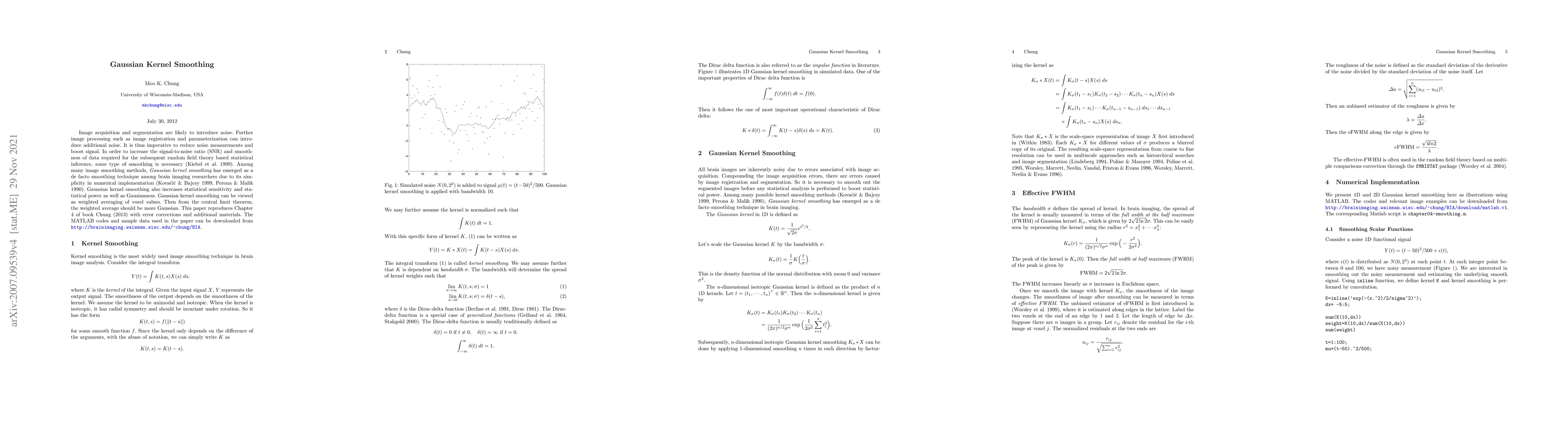 Image acquisition and segmentation are likely to introduce noise. Further image processing such as image registration and parameterization can introduce additional noise. It is thus imperative to reduce noise measurements and boost signal. In order to increase the signal-to-noise ratio (SNR) and smoothness of data required for the subsequent random field theory based statistical inference, some type of smoothing is necessary. Among many image smoothing methods, Gaussian kernel smoothing has emerged as a de facto smoothing technique among brain imaging researchers due to its simplicity in numerical implementation. Gaussian kernel smoothing also increases statistical sensitivity and statistical power as well as Gausianness. Gaussian kernel smoothing can be viewed as weighted averaging of voxel values. Then from the central limit theorem, the weighted average should be more Gaussian.