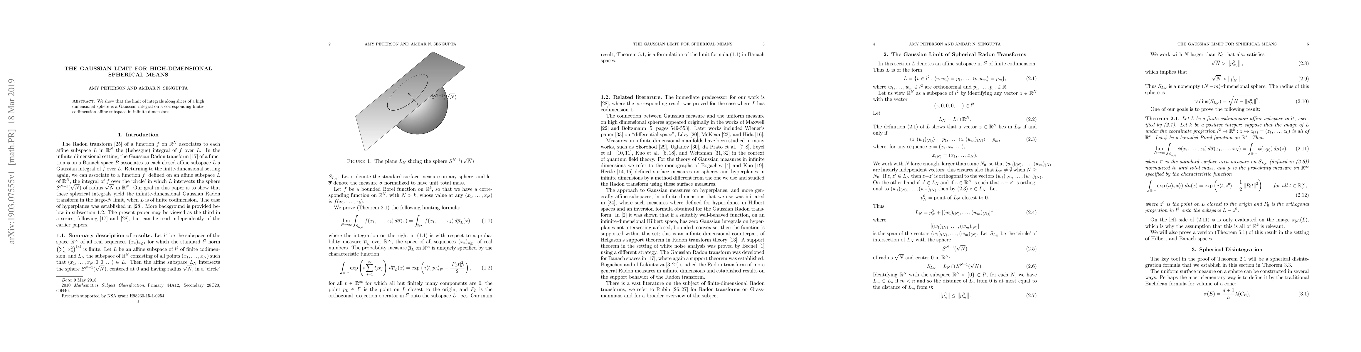We show that the limit of integrals along slices of a high dimensional sphere is a Gaussian integral on a corresponding finite-codimension affine subspace in infinite dimensions.
