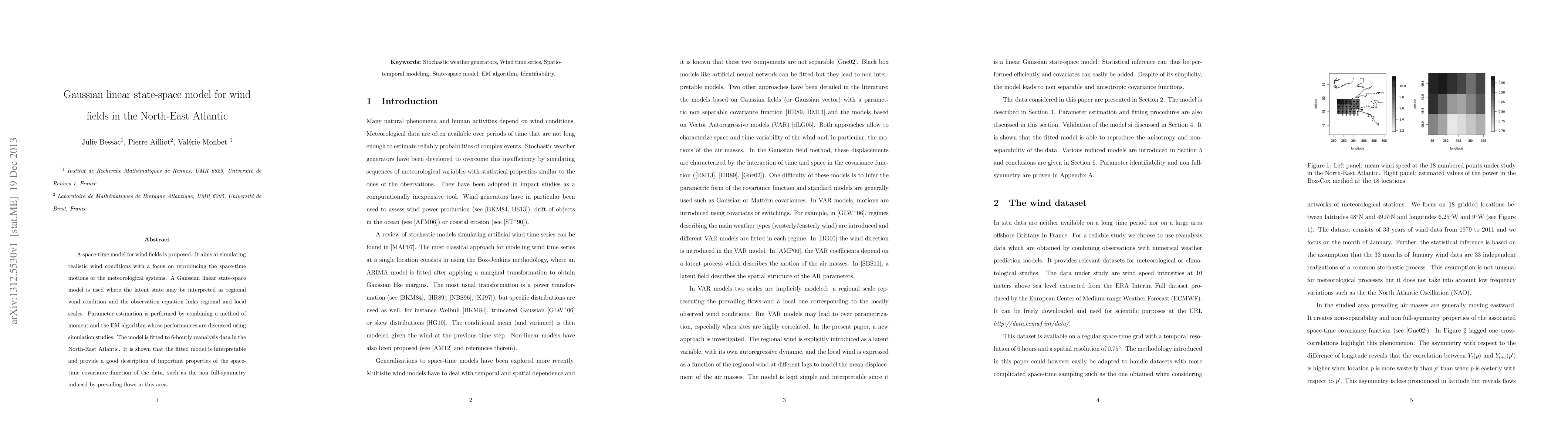 A space-time model for wind fields is proposed. It aims at simulating realistic wind conditions with a focus on reproducing the space-time motions of the meteorological systems. A Gaussian linear state-space model is used where the latent state may be interpreted as regional wind condition and the observation equation links regional and local scales. Parameter estimation is performed by combining a method of moment and the EM algorithm whose performances are discussed using simulation studies. The model is fitted to 6-hourly reanalysis data in the North-East Atlantic. It is shown that the fitted model is interpretable and provide a good description of important properties of the space-time covariance function of the data, such as the non full-symmetry induced by prevailing flows in this area.