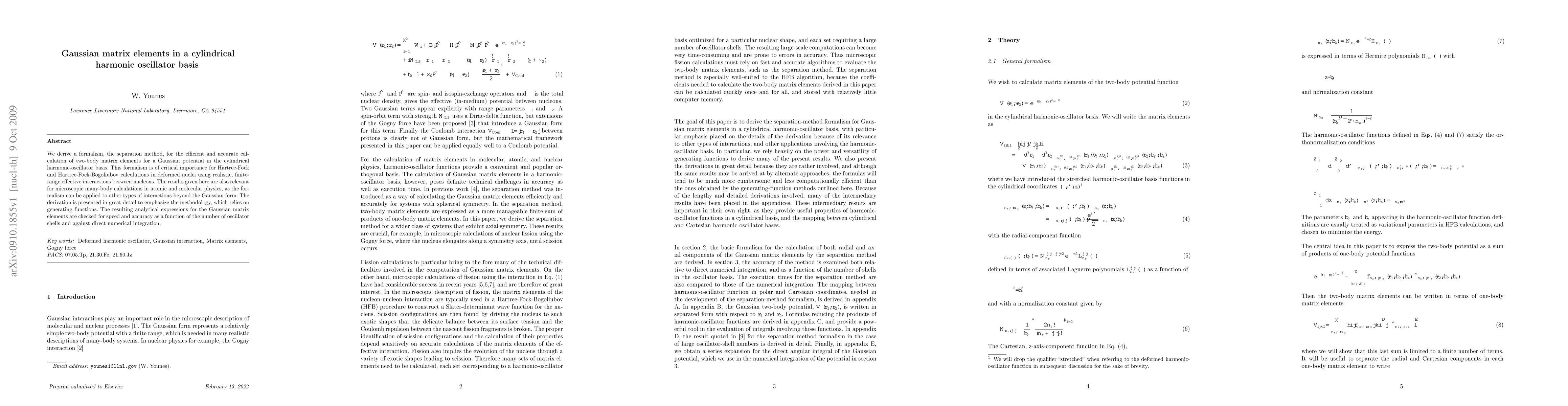 This paper presents a detailed derivation of a separation method for efficiently calculating two-body matrix elements for Gaussian potentials in a cylindrical harmonic-oscillator basis, crucial for Hartree-Fock and related calculations in deformed nuclei and applicable to various interactions in atomic and molecular physics. The methodology is validated through analytical expressions compared against numerical integration.