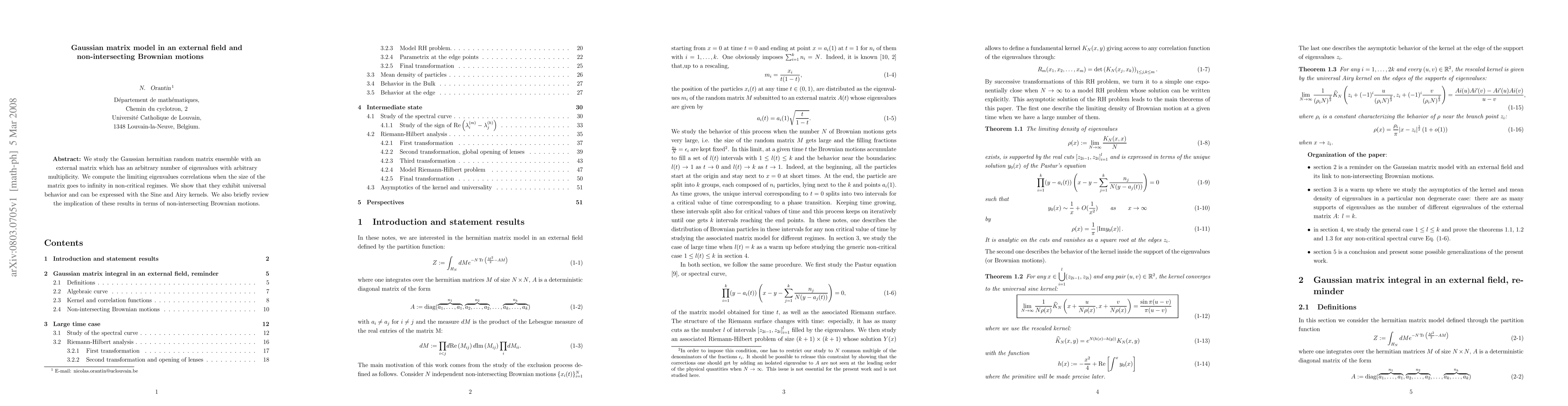 This paper investigates the Gaussian Hermitian random matrix model under an external field, revealing universal limiting eigenvalue correlations expressed via Sine and Airy kernels. It also connects these findings to the behavior of non-intersecting Brownian motions.