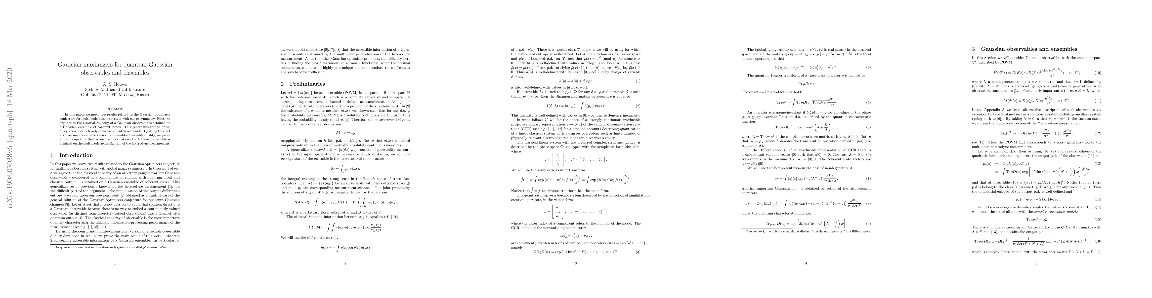 In this paper we prove two results related to the Gaussian optimizers conjecture for multimode bosonic system with gauge symmetry. First, we argue that the classical capacity of a Gaussian observable is attained on a Gaussian ensemble of coherent states. This generalizes results previously known for heterodyne measurement in one mode. By using this fact and continuous variable version of ensemble-observable duality, we prove an old conjecture that accessible information of a Gaussian ensemble is attained on the multimode generalization of the heterodyne measurement.