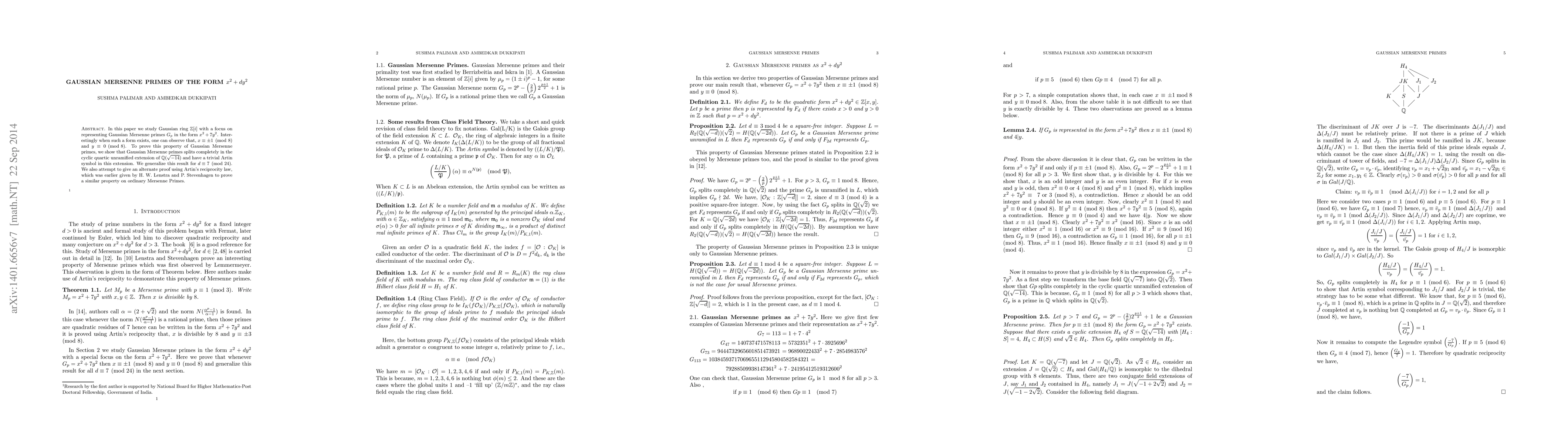 This paper explores Gaussian Mersenne primes in the form $x^2 + 7y^2$ within the Gaussian ring $\mathbb{Z}[i]$, proving that $x \equiv \pm 1 \pmod{8}$ and $y \equiv 0 \pmod{8}$ when such representations exist. The authors generalize these findings for $d \equiv 7 \pmod{24}$ and attempt an alternate proof using Artin's reciprocity law.