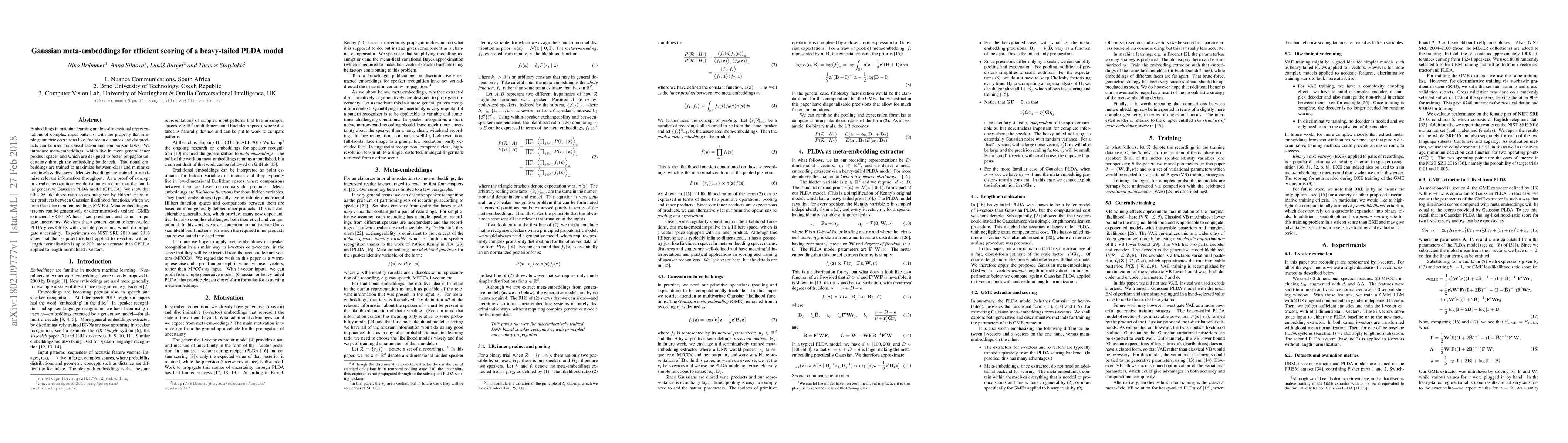 Embeddings in machine learning are low-dimensional representations of complex input patterns, with the property that simple geometric operations like Euclidean distances and dot products can be used for classification and comparison tasks. The proposed meta-embeddings are special embeddings that live in more general inner product spaces. They are designed to propagate uncertainty to the final output in speaker recognition and similar applications. The familiar Gaussian PLDA model (GPLDA) can be re-formulated as an extractor for Gaussian meta-embeddings (GMEs), such that likelihood ratio scores are given by Hilbert space inner products between Gaussian likelihood functions. GMEs extracted by the GPLDA model have fixed precisions and do not propagate uncertainty. We show that a generalization to heavy-tailed PLDA gives GMEs with variable precisions, which do propagate uncertainty. Experiments on NIST SRE 2010 and 2016 show that the proposed method applied to i-vectors without length normalization is up to 20% more accurate than GPLDA applied to length-normalized ivectors.