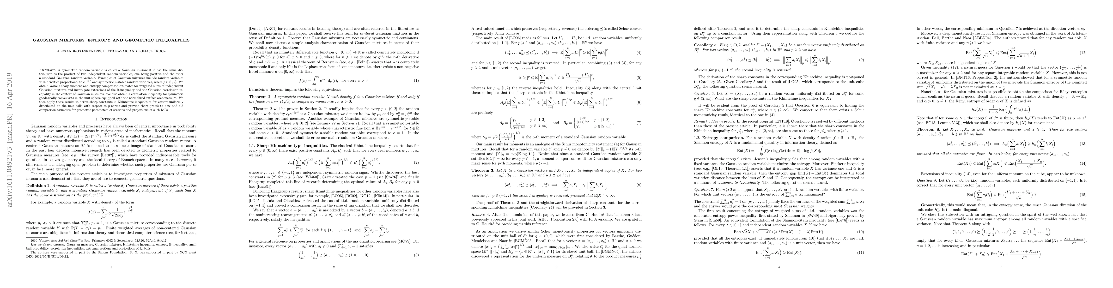 This paper investigates Gaussian mixtures, deriving sharp moment and entropy estimates for their weighted sums and extending inequalities like the B-inequality and Gaussian correlation inequality. It also establishes a correlation inequality for symmetric geodesically convex sets and applies these results to derive sharp constants in Khintchine inequalities for uniformly distributed vectors on unit balls.