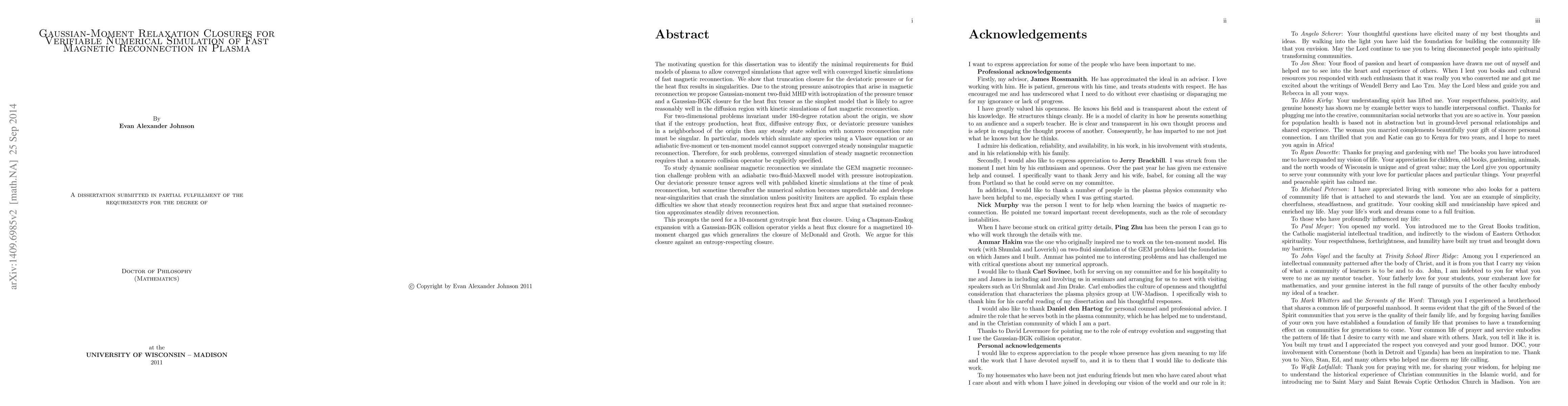 The motivating question for this dissertation was to identify the minimal requirements for fluid models of plasma to allow converged simulations that agree well with converged kinetic simulations of fast magnetic reconnection. We show that truncation closure for the deviatoric pressure or for the heat flux results in singularities. Due to the strong pressure anisotropies that arise, we study magnetic reconnection with a Gaussian-moment two-fluid MHD with isotropization of the pressure tensor. For the GEM magnetic reconnection challenge problem, our deviatoric pressure tensor agrees well with published kinetic simulations at the time of peak reconnection, but sometime thereafter the numerical solution becomes unpredictable and develops near-singularities that crash the simulation unless positivity limiters are applied. To explain these difficulties, we show that steady reconnection requires heat flux. Specifically, for two-dimensional problems invariant under 180-degree rotation about the X-point, entropy production in the vicinity of the X-point is necessary for reconnection and causes solutions to become singular for conservative models that lack heat flux. This prompts the need for a 10-moment gyrotropic heat flux closure. Using a Chapman-Enskog expansion with a Gaussian-BGK collision operator yields a heat flux closure for a magnetized 10-moment charged gas which generalizes the closure of McDonald and Groth.