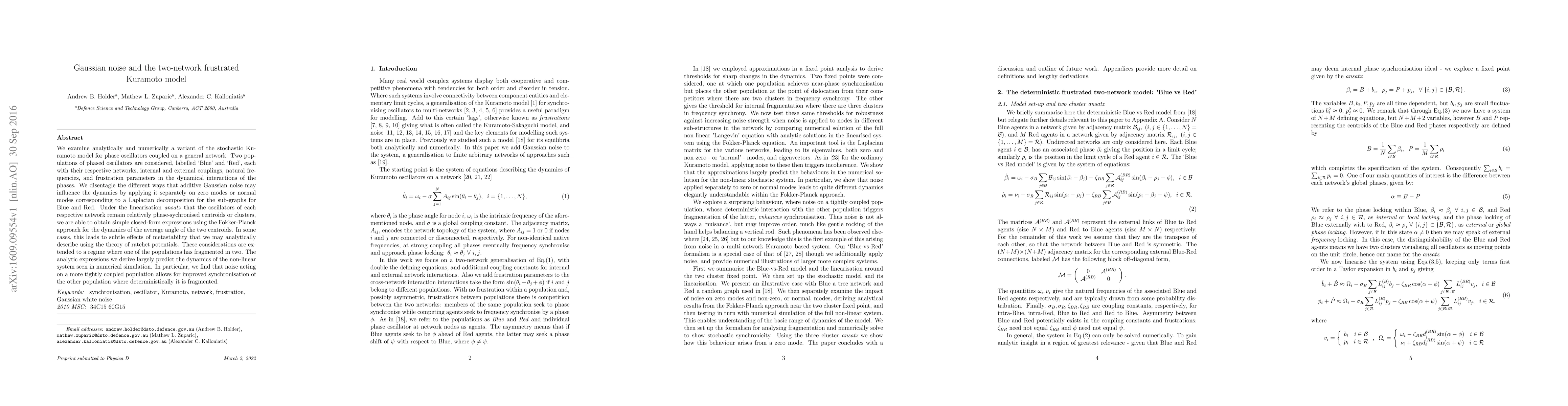 We examine analytically and numerically a variant of the stochastic Kuramoto model for phase oscillators coupled on a general network. Two populations of phased oscillators are considered, labelled `Blue' and `Red', each with their respective networks, internal and external couplings, natural frequencies, and frustration parameters in the dynamical interactions of the phases. We disentagle the different ways that additive Gaussian noise may influence the dynamics by applying it separately on zero modes or normal modes corresponding to a Laplacian decomposition for the sub-graphs for Blue and Red. Under the linearisation ansatz that the oscillators of each respective network remain relatively phase-sychronised centroids or clusters, we are able to obtain simple closed-form expressions using the Fokker-Planck approach for the dynamics of the average angle of the two centroids. In some cases, this leads to subtle effects of metastability that we may analytically describe using the theory of ratchet potentials. These considerations are extended to a regime where one of the populations has fragmented in two. The analytic expressions we derive largely predict the dynamics of the non-linear system seen in numerical simulation. In particular, we find that noise acting on a more tightly coupled population allows for improved synchronisation of the other population where deterministically it is fragmented.