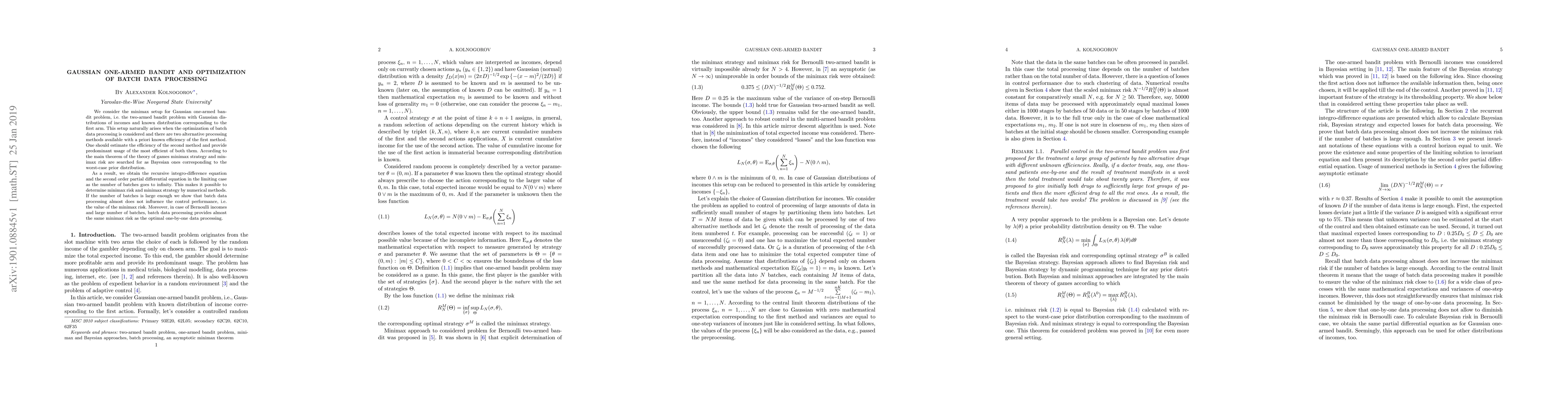 This paper explores the Gaussian one-armed bandit problem in a minimax setup, focusing on optimizing batch data processing between two methods. The authors derive recursive and differential equations to determine minimax risk and strategy, showing that batch processing maintains control performance when the number of batches is sufficiently large.