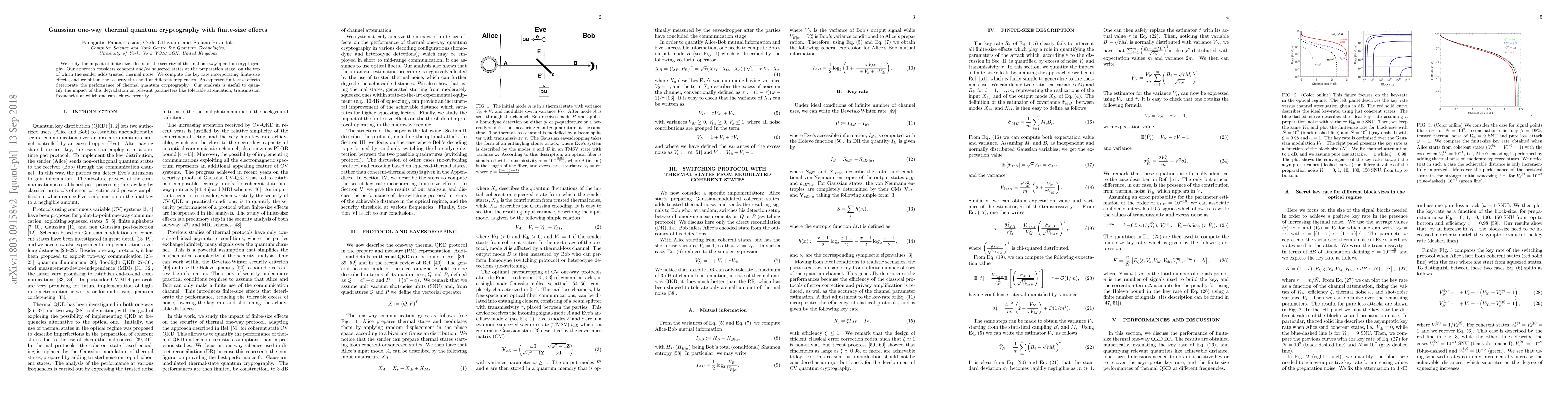 This paper investigates the security of thermal one-way quantum cryptography under finite-size effects, using coherent/squeezed states and adding trusted thermal noise. It computes the key rate and security threshold, revealing that finite-size effects degrade performance, impacting parameters like attenuation and secure transmission frequencies.