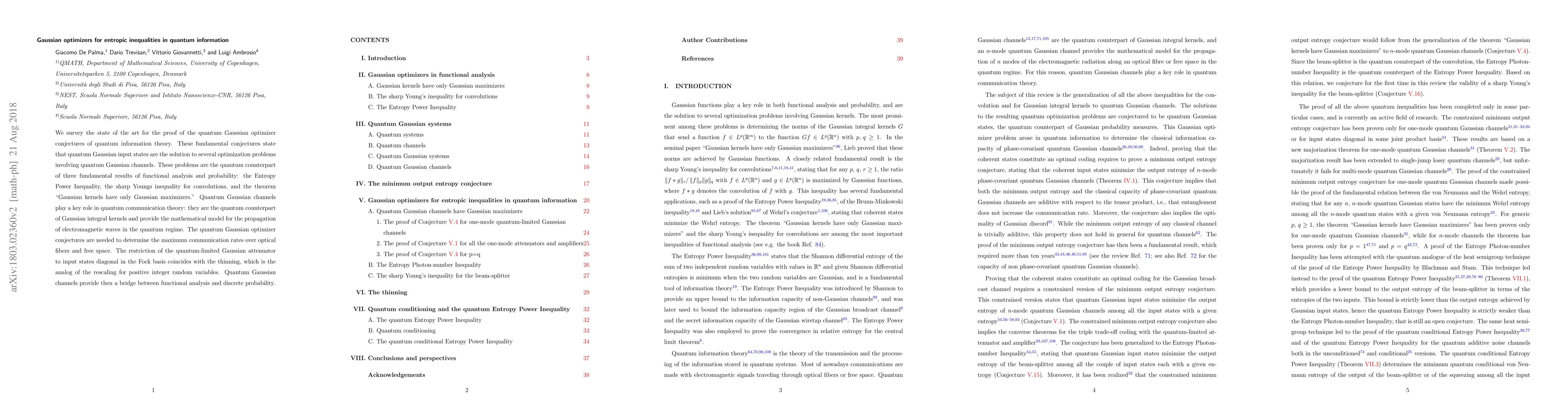 We survey the state of the art for the proof of the quantum Gaussian optimizer conjectures of quantum information theory. These fundamental conjectures state that quantum Gaussian input states are the solution to several optimization problems involving quantum Gaussian channels. These problems are the quantum counterpart of three fundamental results of functional analysis and probability: the Entropy Power Inequality, the sharp Young's inequality for convolutions, and the theorem "Gaussian kernels have only Gaussian maximizers." Quantum Gaussian channels play a key role in quantum communication theory: they are the quantum counterpart of Gaussian integral kernels and provide the mathematical model for the propagation of electromagnetic waves in the quantum regime. The quantum Gaussian optimizer conjectures are needed to determine the maximum communication rates over optical fibers and free space. The restriction of the quantum-limited Gaussian attenuator to input states diagonal in the Fock basis coincides with the thinning, which is the analog of the rescaling for positive integer random variables. Quantum Gaussian channels provide then a bridge between functional analysis and discrete probability.