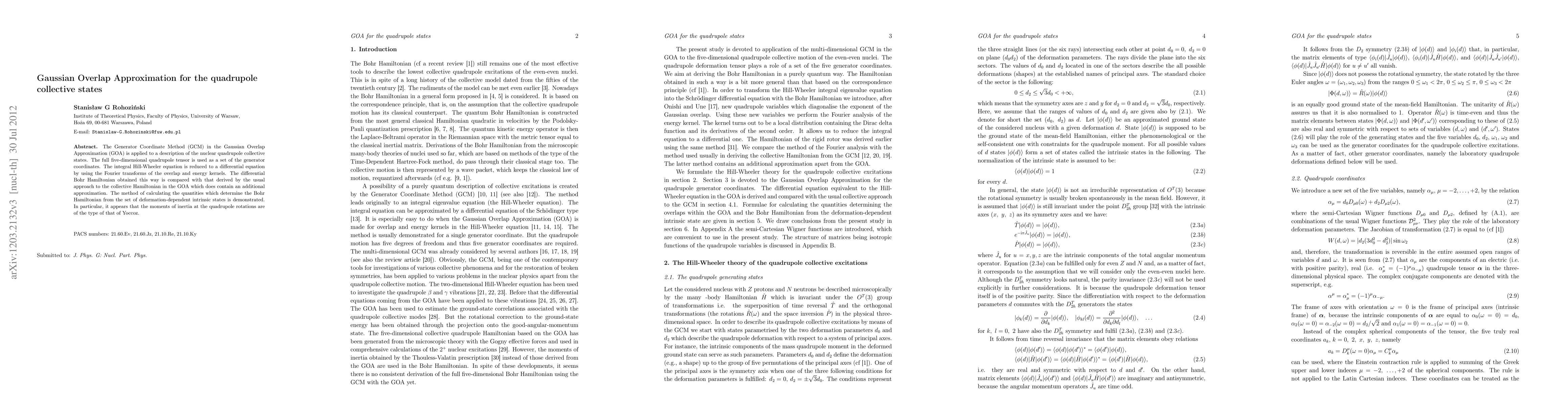 This paper applies the Generator Coordinate Method in the Gaussian Overlap Approximation to describe nuclear quadrupole collective states, using the full five-dimensional quadrupole tensor as generator coordinates. It compares the differential Bohr Hamiltonian derived from this method to one obtained via a traditional approach, highlighting the moments of inertia at quadrupole rotations akin to Yoccoz's model.