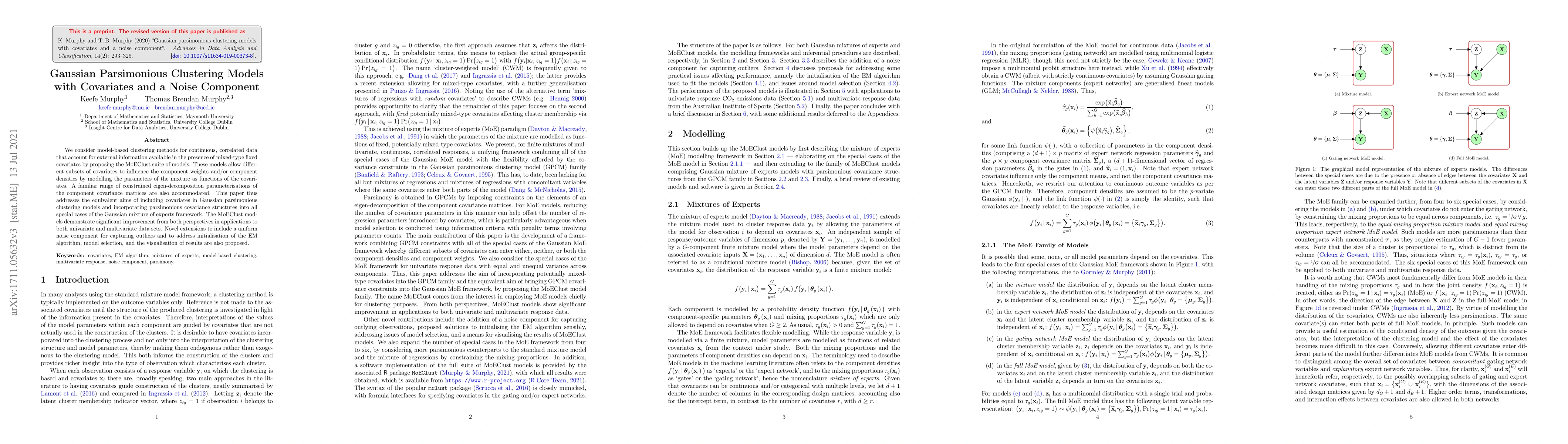 The paper presents the MoEClust suite of models, which extend Gaussian parsimonious clustering models to include covariates and a noise component, along with novel extensions and initialisation strategies for the EM algorithm.