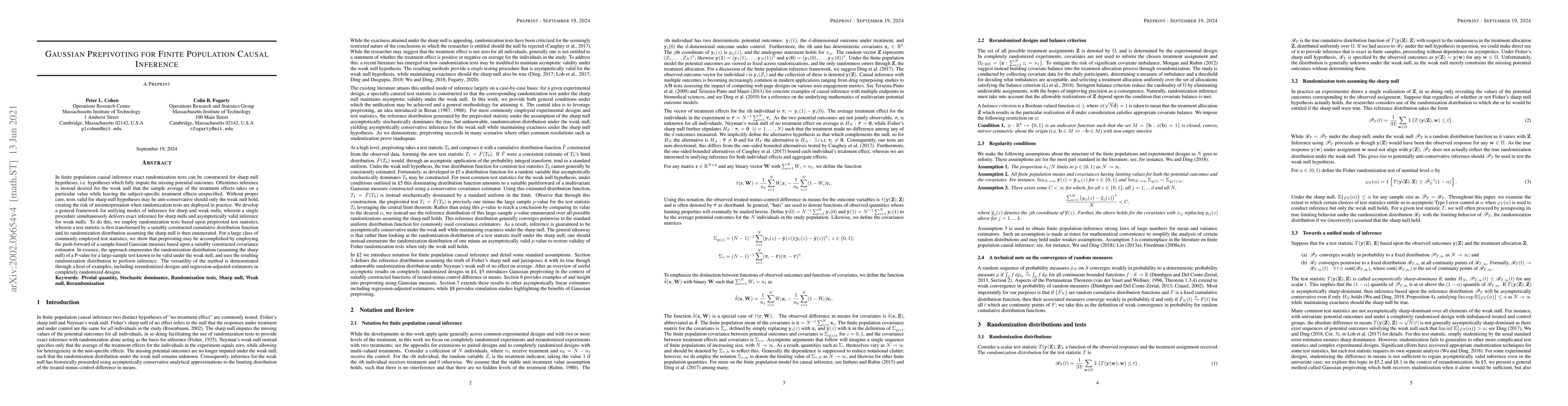 This paper develops a Gaussian prepivoting framework for finite population causal inference, enabling exact inference for sharp null hypotheses and asymptotically valid inference for weak null hypotheses. The method transforms test statistics using a Gaussian measure and demonstrates its versatility through various examples.