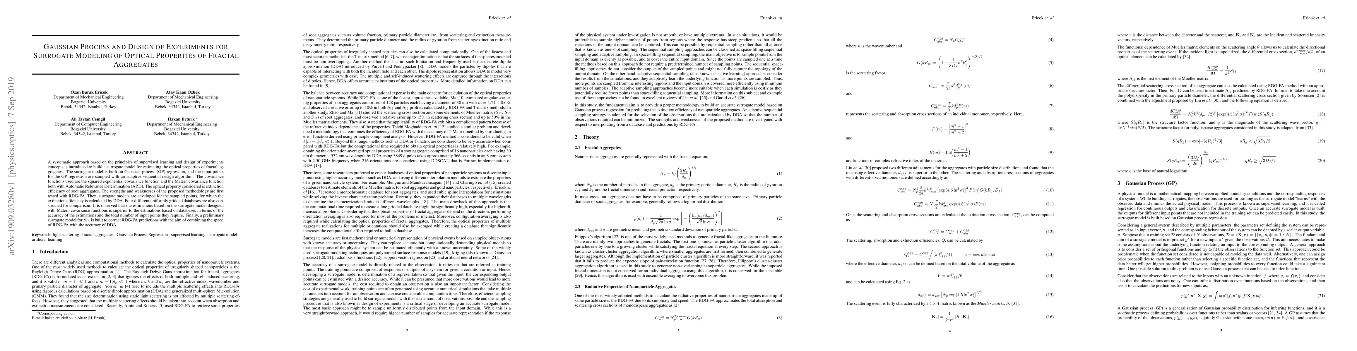 A systematic approach based on the principles of supervised learning and design of experiments concepts is introduced to build a surrogate model for estimating the optical properties of fractal aggregates. The surrogate model is built on Gaussian process (GP) regression, and the input points for the GP regression are sampled with an adaptive sequential design algorithm. The covariance functions used are the squared exponential covariance function and the Matern covariance function both with Automatic Relevance Determination (ARD). The optical property considered is extinction efficiency of soot aggregates. The strengths and weaknesses of the proposed methodology are first tested with RDG-FA. Then, surrogate models are developed for the sampled points, for which the extinction efficiency is calculated by DDA. Four different uniformly gridded databases are also constructed for comparison. It is observed that the estimations based on the surrogate model designed with Matern covariance functions is superior to the estimations based on databases in terms of the accuracy of the estimations and the total number of input points they require. Finally, a preliminary surrogate model for S 11 is built to correct RDG-FA predictions with the aim of combining the speed of RDG-FA with the accuracy of DDA.