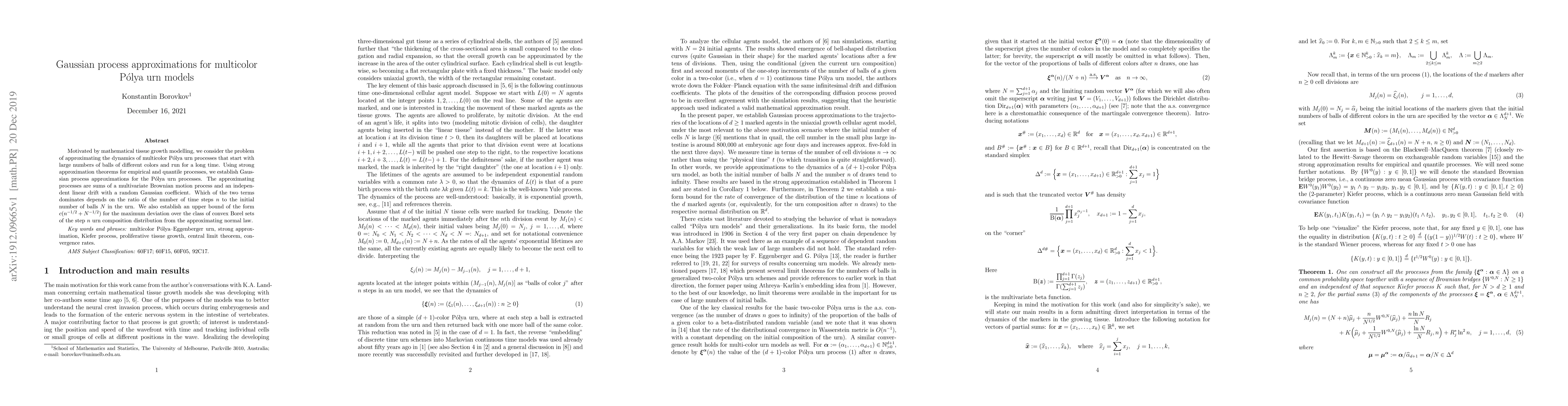Motivated by mathematical tissue growth modelling, we consider the problem of approximating the dynamics of multicolor P\'olya urn processes that start with large numbers of balls of different colors and run for a long time. Using strong approximation theorems for empirical and quantile processes, we establish Gaussian process approximations for the P\'olya urn processes. The approximating processes are sums of a multivariate Brownian motion process and an independent linear drift with a random Gaussian coefficient. Which of the two terms dominates depends on the ratio of the number of time steps $n$ to the initial number of balls $N$ in the urn. We also establish an upper bound of the form $c(n^{-1/2}+N^{-1/2})$ for the maximum deviation over the class of convex Borel sets of the step $n$ urn composition distribution from the approximating normal law.