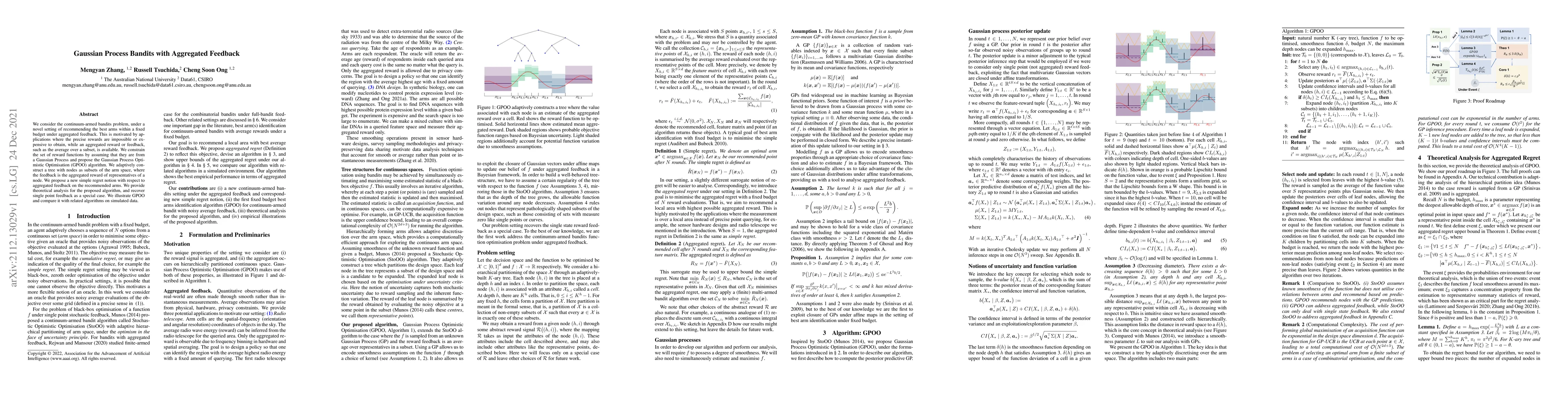 This paper proposes the Gaussian Process Optimistic Optimisation (GPOO) algorithm for the continuum-armed bandits problem under aggregated feedback, where precise rewards are impractical. The algorithm constructs a tree to adaptively select arms based on aggregated rewards and provides theoretical analysis for its performance.
