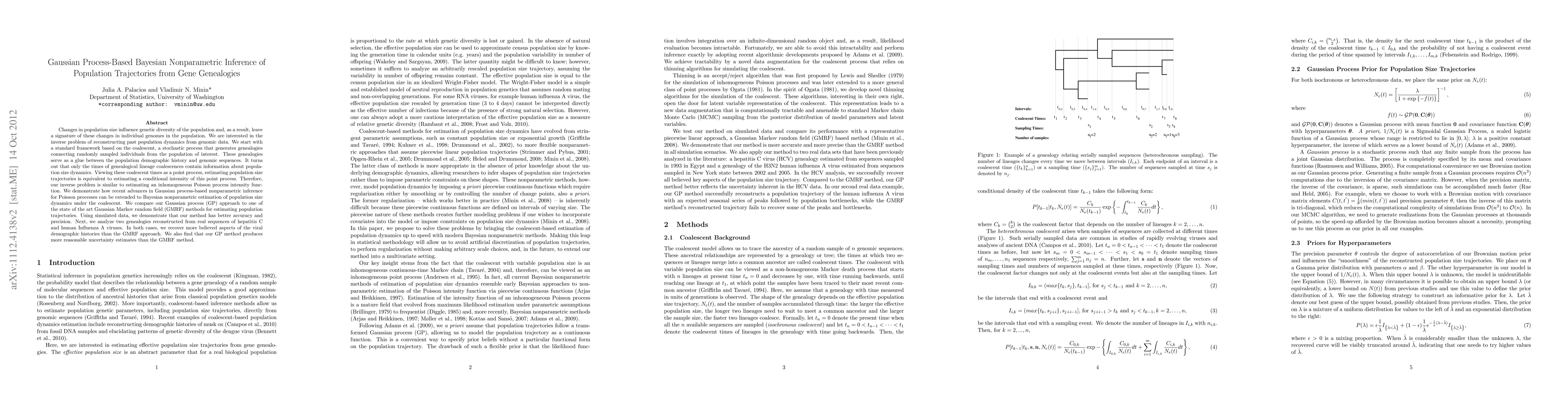 This paper proposes a Gaussian process-based Bayesian nonparametric method for inferring population size trajectories from gene genealogies, demonstrating superior accuracy and precision compared to a Gaussian Markov random field approach using both simulated and real viral sequence data. The method effectively estimates population dynamics by modeling coalescent times as an inhomogeneous Poisson process.