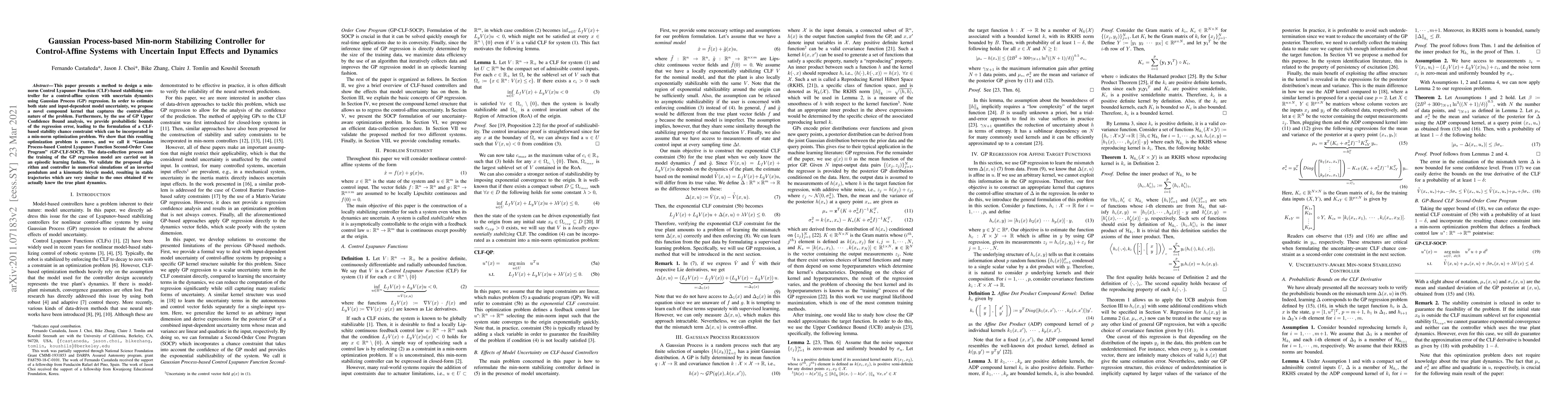 This paper designs a min-norm stabilizing controller for control-affine systems using Gaussian Process regression to handle uncertain dynamics and input effects. It introduces a novel compound kernel and formulates a convex GP-CLF-SOCP optimization problem to ensure stability.