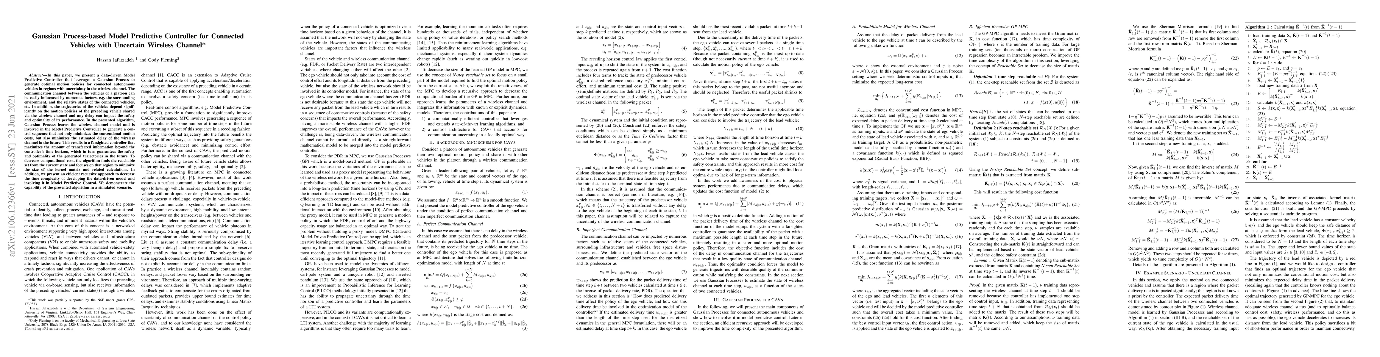 This paper proposes a Gaussian Process-based Model Predictive Controller for connected autonomous vehicles, which learns the uncertain wireless channel model and minimizes both motion costs and estimated future channel delay to ensure safety and optimality. The approach reduces computational costs by focusing on reachable states and employs a recursive method to enhance efficiency.
