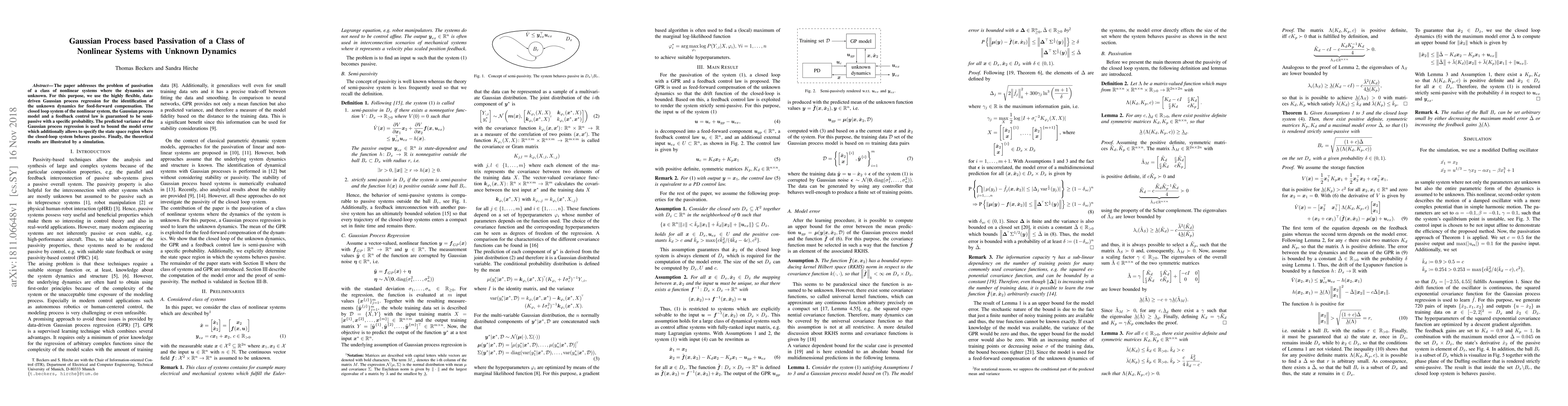 This paper proposes a Gaussian process regression approach to passivate nonlinear systems with unknown dynamics. The method identifies the system's dynamics for feed-forward compensation, ensuring the closed-loop system is semi-passive with a specified probability, and uses the Gaussian process's variance to bound model errors and define passive behavior regions. Simulation results validate the theoretical findings.