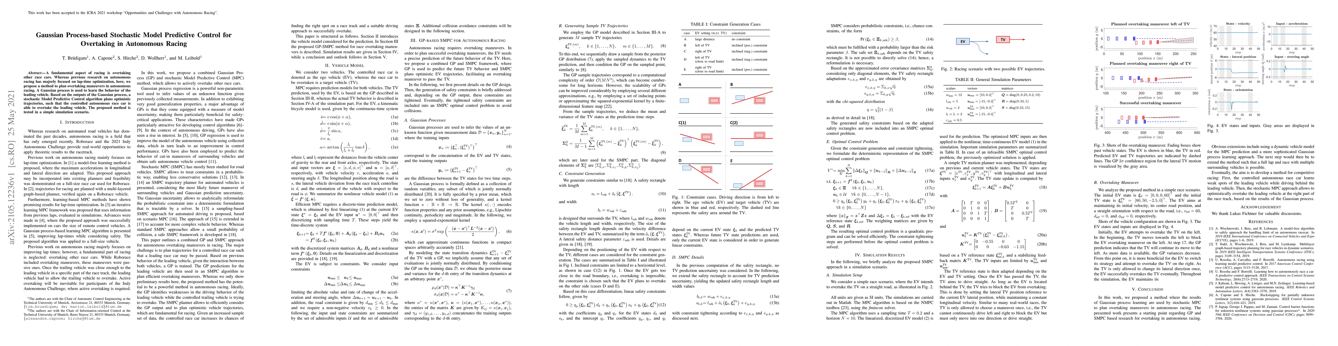 A fundamental aspect of racing is overtaking other race cars. Whereas previous research on autonomous racing has majorly focused on lap-time optimization, here, we propose a method to plan overtaking maneuvers in autonomous racing. A Gaussian process is used to learn the behavior of the leading vehicle. Based on the outputs of the Gaussian process, a stochastic Model Predictive Control algorithm plans optimistic trajectories, such that the controlled autonomous race car is able to overtake the leading vehicle. The proposed method is tested in a simple simulation scenario.