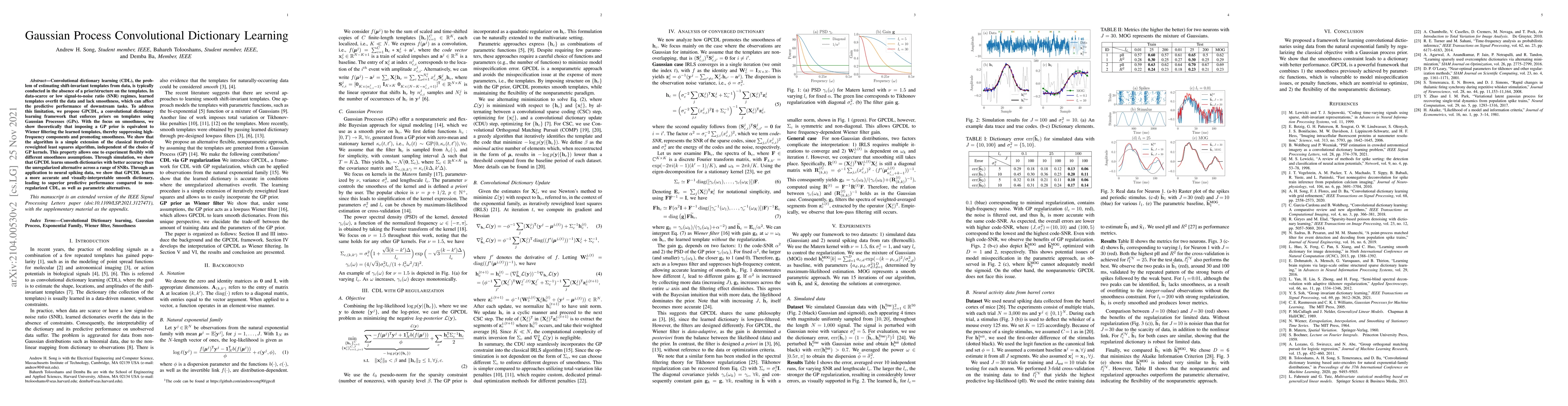 This paper proposes GPCDL, a convolutional dictionary learning framework that uses Gaussian Processes to enforce smoothness priors on templates, addressing overfitting in data-scarce conditions. The method enhances predictive performance by learning smoother and more accurate dictionaries, demonstrated through simulations and neural spiking data applications.