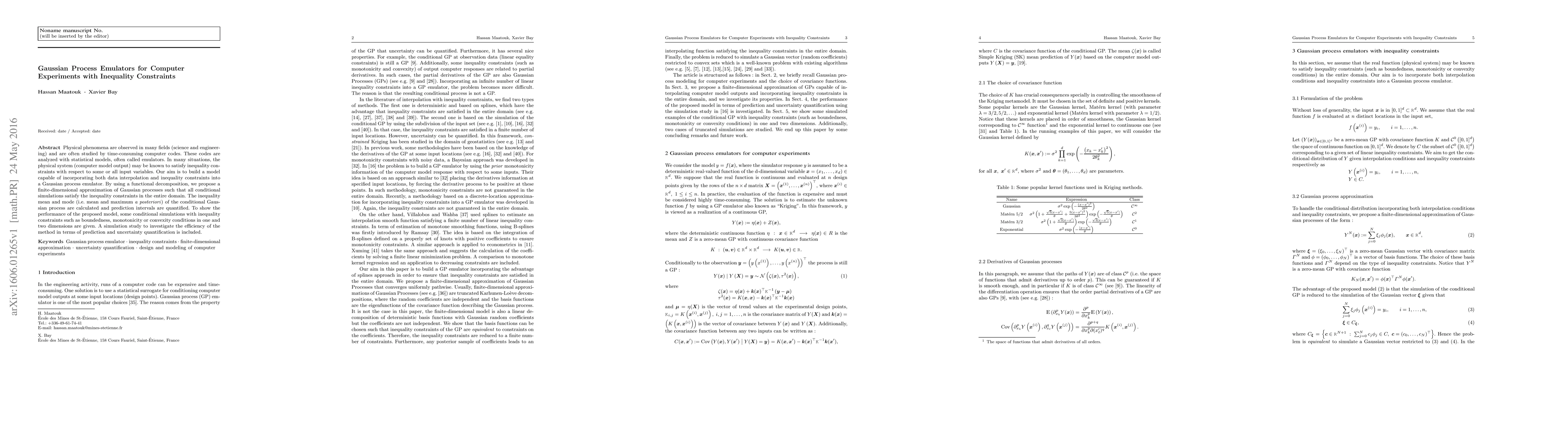 Physical phenomena are observed in many fields (sciences and engineering) and are often studied by time-consuming computer codes. These codes are analyzed with statistical models, often called emulators. In many situations, the physical system (computer model output) may be known to satisfy inequality constraints with respect to some or all input variables. Our aim is to build a model capable of incorporating both data interpolation and inequality constraints into a Gaussian process emulator. By using a functional decomposition, we propose to approximate the original Gaussian process by a finite-dimensional Gaussian process such that all conditional simulations satisfy the inequality constraints in the whole domain. The mean, mode (maximum a posteriori) and prediction intervals (uncertainty quantification) of the conditional Gaussian process are calculated. To investigate the performance of the proposed model, some conditional simulations with inequality constraints such as boundary, monotonicity or convexity conditions are given. 1. Introduction. In the engineering activity, runs of a computer code can be expensive and time-consuming. One solution is to use a statistical surrogate for conditioning computer model outputs at some input locations (design points). Gaussian process (GP) emulator is one of the most popular choices [23]. The reason comes from the property of the GP that uncertainty quantification can be calculated. Furthermore, it has several nice properties. For example, the conditional GP at observation data (linear equality constraints) is still a GP [5]. Additionally, some inequality constraints (such as monotonicity and convexity) of output computer responses are related to partial derivatives. In such cases, the partial derivatives of the GP are also GPs. Incorporating an infinite number of linear inequality constraints into a GP emulator, the problem becomes more difficult. The reason is that the resulting conditional process is not a GP. In the literature of interpolation with inequality constraints, we find two types of meth-ods. The first one is deterministic and based on splines, which have the advantage that the inequality constraints are satisfied in the whole input domain (see e.g. [16], [24] and [25]). The second one is based on the simulation of the conditional GP by using the subdivision of the input set (see e.g. [1], [6] and [11]). In that case, the inequality constraints are satisfied in a finite number of input locations. Notice that the advantage of such method is that un-certainty quantification can be calculated. In previous work, some methodologies have been based on the knowledge of the derivatives of the GP at some input locations ([11], [21] and [26]). For monotonicity constraints with noisy data, a Bayesian approach was developed in [21]. In [11] the problem is to build a GP emulator by using the prior monotonicity