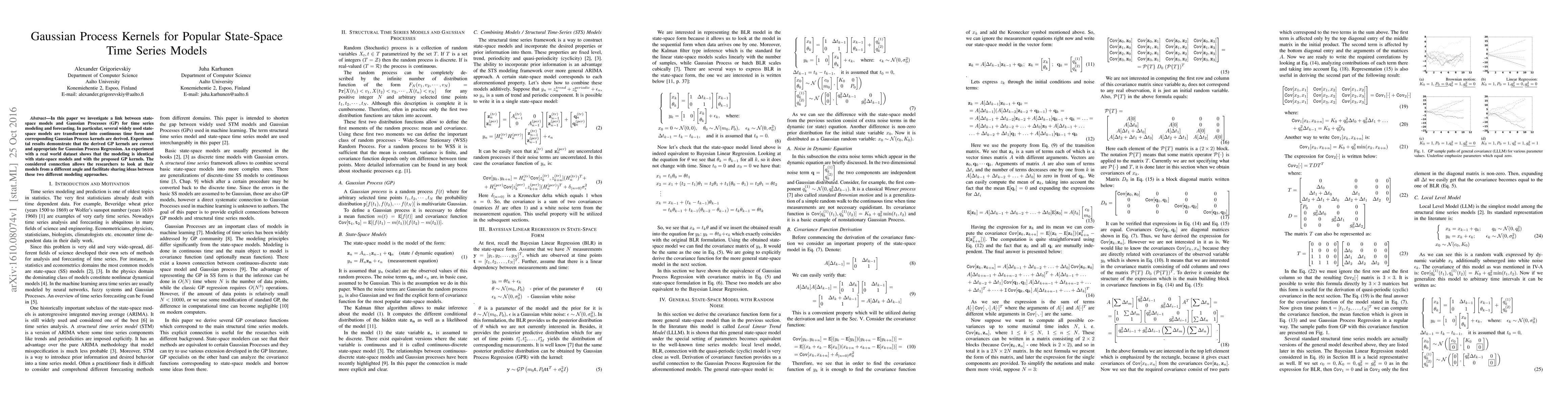 This paper explores the connection between state-space models and Gaussian Processes for time series modeling, deriving Gaussian Process kernels from popular state-space models. Experimental results confirm the appropriateness of these kernels for Gaussian Process Regression, showing equivalent performance with real-world data.