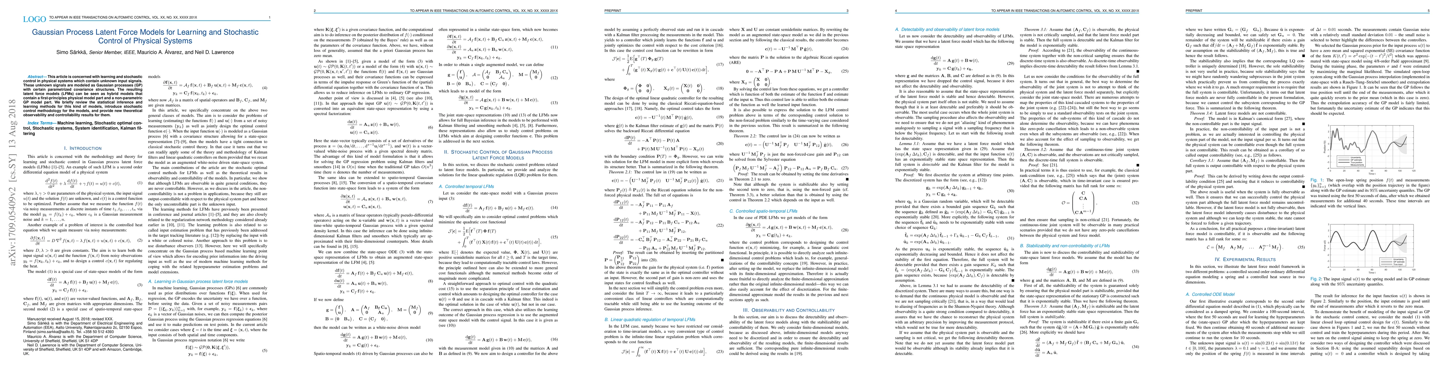 This paper develops Gaussian Process Latent Force Models (LFMs) for learning and stochastic control in physical systems with unknown input signals, combining first-principles and non-parametric GP models. It also introduces new theoretical insights on observability and controllability for these hybrid models.