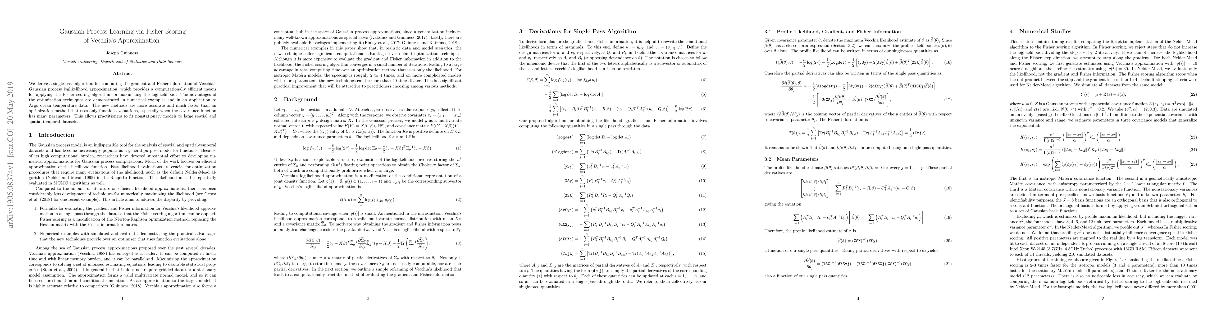 The paper presents a single-pass algorithm for computing the gradient and Fisher information of Vecchia's Gaussian process loglikelihood approximation, enabling efficient maximization of the loglikelihood via Fisher scoring.