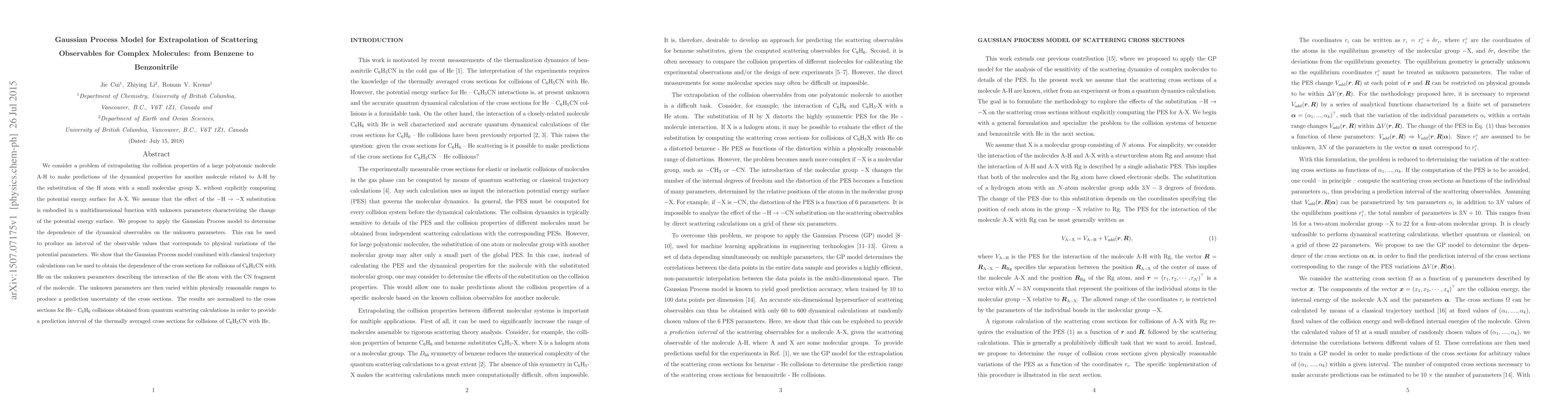 We consider a problem of extrapolating the collision properties of a large polyatomic molecule A-H to make predictions of the dynamical properties for another molecule related to A-H by the substitution of the H atom with a small molecular group X, without explicitly computing the potential energy surface for A-X. We assume that the effect of the $-$H $\rightarrow$ $-$X substitution is embodied in a multidimensional function with unknown parameters characterizing the change of the potential energy surface. We propose to apply the Gaussian Process model to determine the dependence of the dynamical observables on the unknown parameters. This can be used to produce an interval of the observable values that corresponds to physical variations of the potential parameters. We show that the Gaussian Process model combined with classical trajectory calculations can be used to obtain the dependence of the cross sections for collisions of C$_6$H$_5$CN with He on the unknown parameters describing the interaction of the He atom with the CN fragment of the molecule. The unknown parameters are then varied within physically reasonable ranges to produce a prediction uncertainty of the cross sections. The results are normalized to the cross sections for He - C$_6$H$_6$ collisions obtained from quantum scattering calculations in order to provide a prediction interval of the thermally averaged cross sections for collisions of C$_6$H$_5$CN with He.