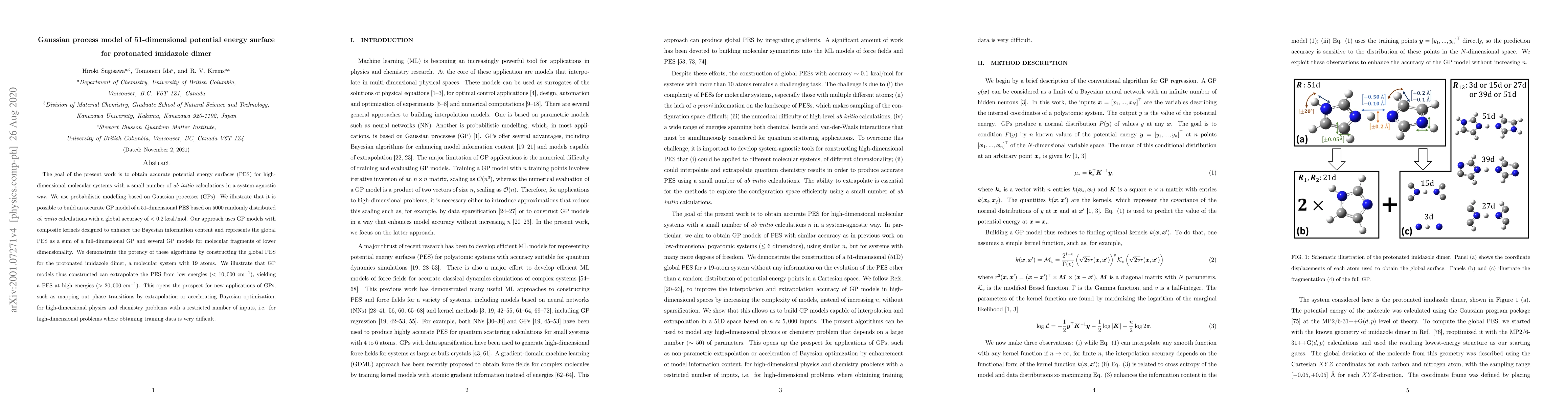 This study demonstrates that Gaussian process models can accurately represent complex, high-dimensional molecular potential energy surfaces using a limited number of calculations, exemplified by the 51-dimensional surface of a protonated imidazole dimer. The approach enables reliable extrapolation across energy ranges, offering new possibilities for modeling challenging chemical systems with minimal data.