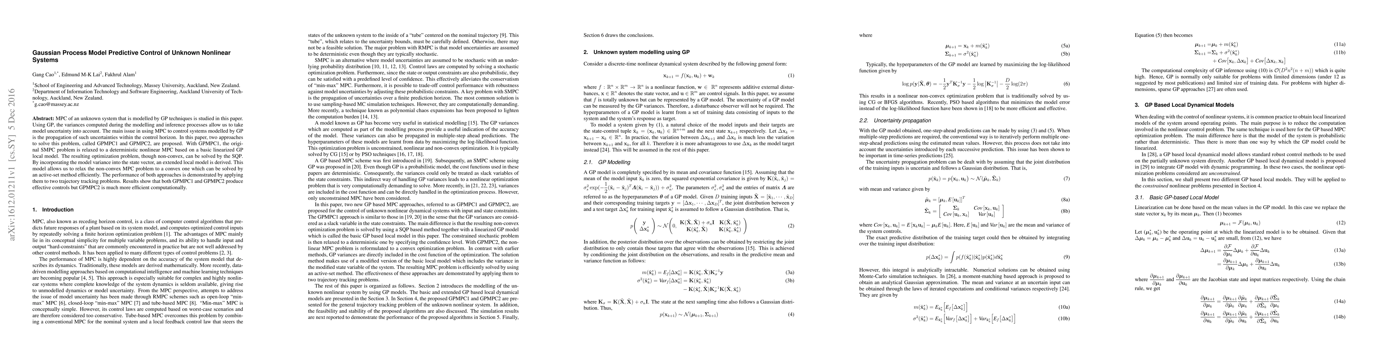 Model Predictive Control (MPC) of an unknown system that is modelled by Gaussian Process (GP) techniques is studied in this paper. Using GP, the variances computed during the modelling and inference processes allow us to take model uncertainty into account. The main issue in using MPC to control systems modelled by GP is the propagation of such uncertainties within the control horizon. In this paper, two approaches to solve this problem, called GPMPC1 and GPMPC2, are proposed. With GPMPC1, the original Stochastic Model Predictive Control (SMPC) problem is relaxed to a deterministic nonlinear MPC based on a basic linearized GP local model. The resulting optimization problem, though non-convex, can be solved by the Sequential Quadratic Programming (SQP). By incorporating the model variance into the state vector, an extended local model is derived. This model allows us to relax the non-convex MPC problem to a convex one which can be solved by an active-set method efficiently. The performance of both approaches is demonstrated by applying them to two trajectory tracking problems. Results show that both GPMPC1 and GPMPC2 produce effective controls but GPMPC2 is much more efficient computationally.