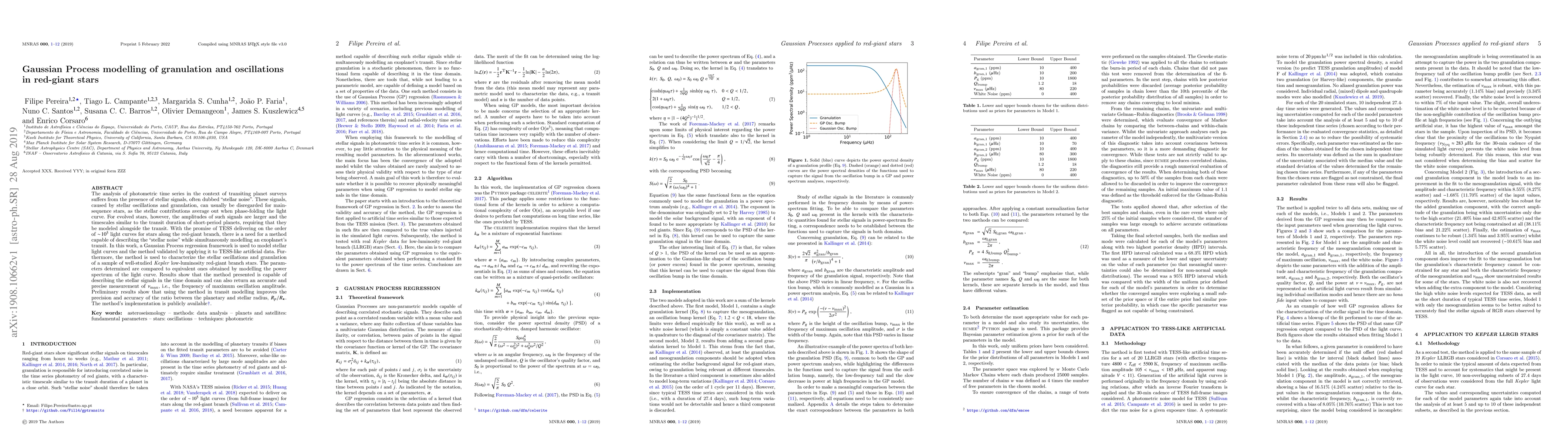 This paper uses Gaussian Process regression to model the "stellar noise" from oscillations and granulation in red-giant stars, which complicates transit analysis. The method is validated on simulated TESS data and applied to Kepler red-giant stars, showing accurate measurement of oscillation frequencies and improved precision in exoplanet transit modeling.