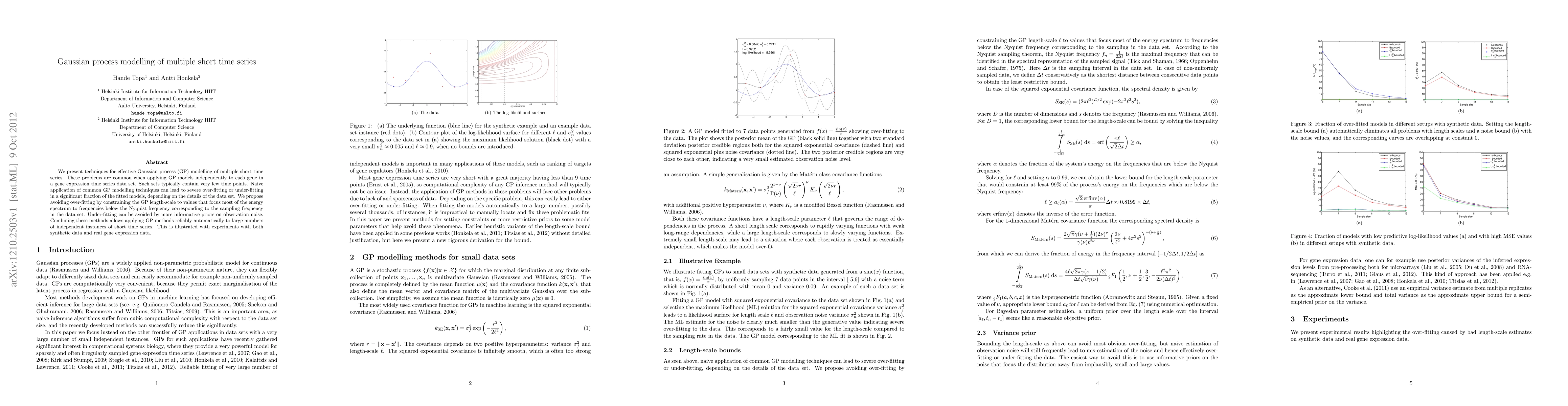 This paper proposes techniques to improve Gaussian process modelling for multiple short time series, addressing overfitting and underfitting issues. It uses constrained length-scales and informative priors to enhance model reliability, demonstrated through experiments on synthetic and real gene expression data.