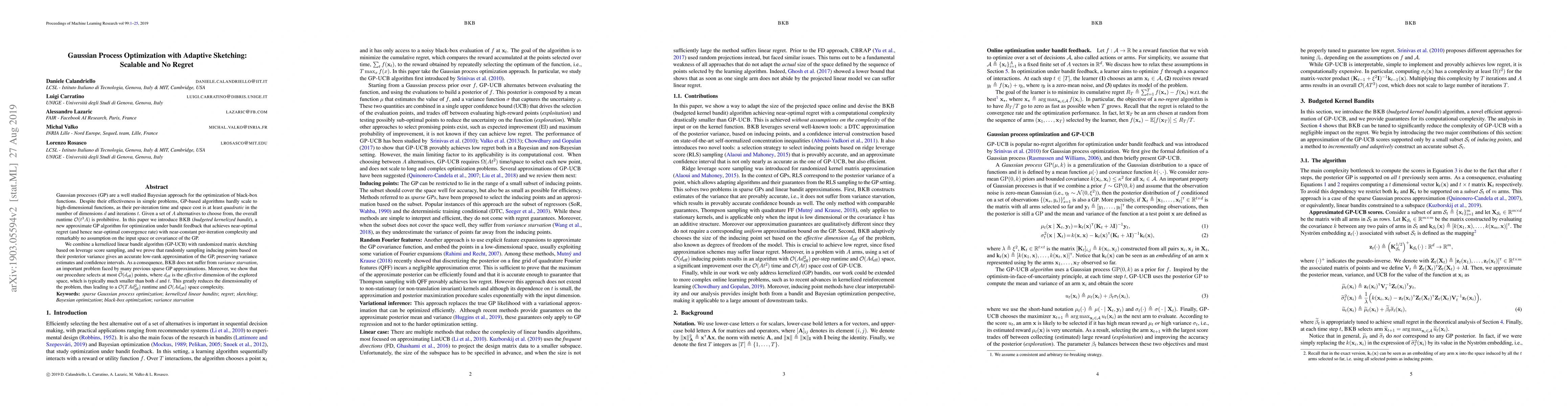 Gaussian processes (GP) are a well studied Bayesian approach for the optimization of black-box functions. Despite their effectiveness in simple problems, GP-based algorithms hardly scale to high-dimensional functions, as their per-iteration time and space cost is at least quadratic in the number of dimensions $d$ and iterations $t$. Given a set of $A$ alternatives to choose from, the overall runtime $O(t^3A)$ is prohibitive. In this paper we introduce BKB (budgeted kernelized bandit), a new approximate GP algorithm for optimization under bandit feedback that achieves near-optimal regret (and hence near-optimal convergence rate) with near-constant per-iteration complexity and remarkably no assumption on the input space or covariance of the GP. We combine a kernelized linear bandit algorithm (GP-UCB) with randomized matrix sketching based on leverage score sampling, and we prove that randomly sampling inducing points based on their posterior variance gives an accurate low-rank approximation of the GP, preserving variance estimates and confidence intervals. As a consequence, BKB does not suffer from variance starvation, an important problem faced by many previous sparse GP approximations. Moreover, we show that our procedure selects at most $\tilde{O}(d_{eff})$ points, where $d_{eff}$ is the effective dimension of the explored space, which is typically much smaller than both $d$ and $t$. This greatly reduces the dimensionality of the problem, thus leading to a $O(TAd_{eff}^2)$ runtime and $O(A d_{eff})$ space complexity.
