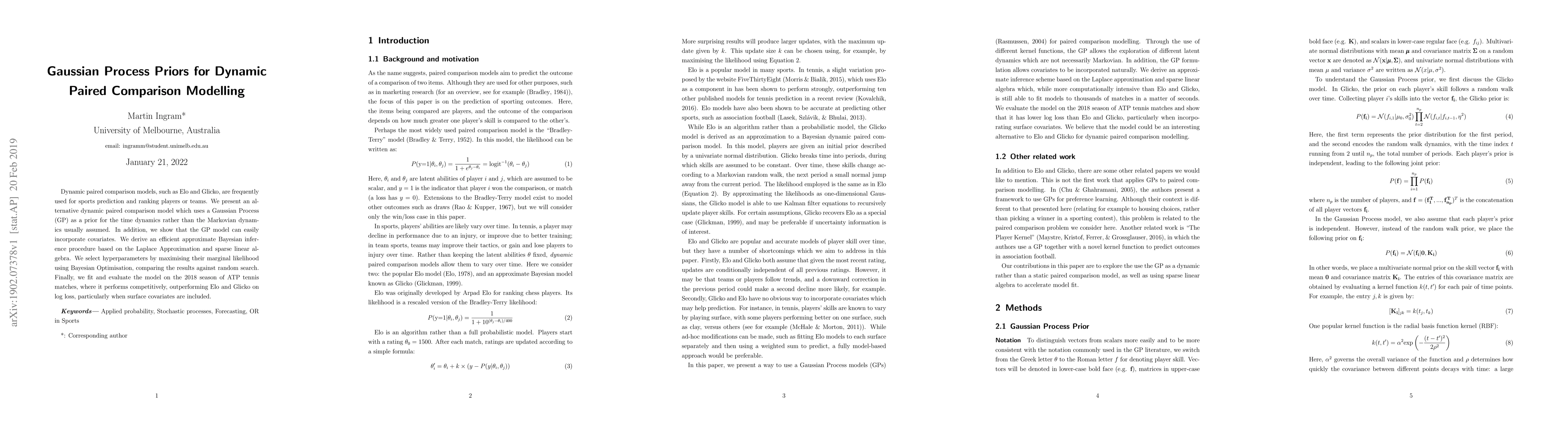 This paper proposes a Gaussian Process prior for dynamic paired comparison models, offering a non-Markovian approach to sports ranking. It demonstrates competitive performance against Elo and Glicko models, especially when incorporating surface covariates, through efficient Bayesian inference and hyperparameter optimization.
