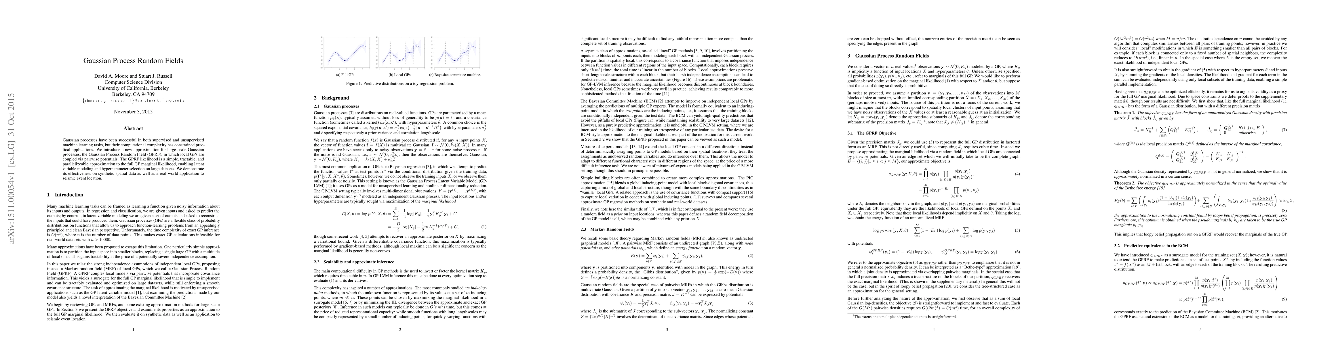 Gaussian processes have been successful in both supervised and unsupervised machine learning tasks, but their computational complexity has constrained practical applications. We introduce a new approximation for large-scale Gaussian processes, the Gaussian Process Random Field (GPRF), in which local GPs are coupled via pairwise potentials. The GPRF likelihood is a simple, tractable, and parallelizeable approximation to the full GP marginal likelihood, enabling latent variable modeling and hyperparameter selection on large datasets. We demonstrate its effectiveness on synthetic spatial data as well as a real-world application to seismic event location.