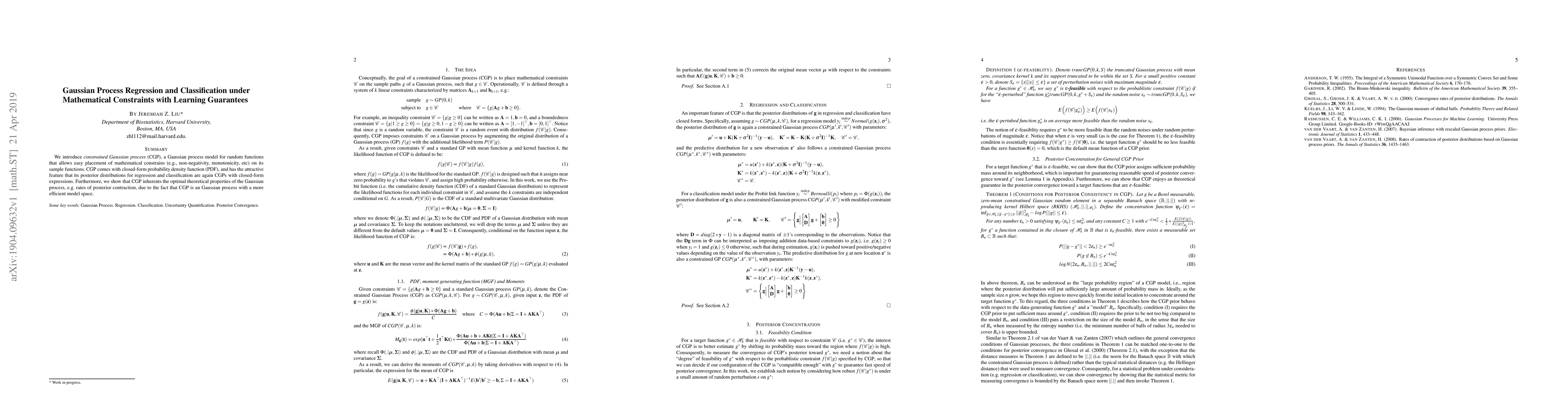 This paper introduces constrained Gaussian process (CGP), a Gaussian process model that incorporates mathematical constraints like non-negativity and monotonicity. It provides closed-form posterior distributions and maintains optimal theoretical properties, ensuring learning guarantees for regression and classification tasks.
