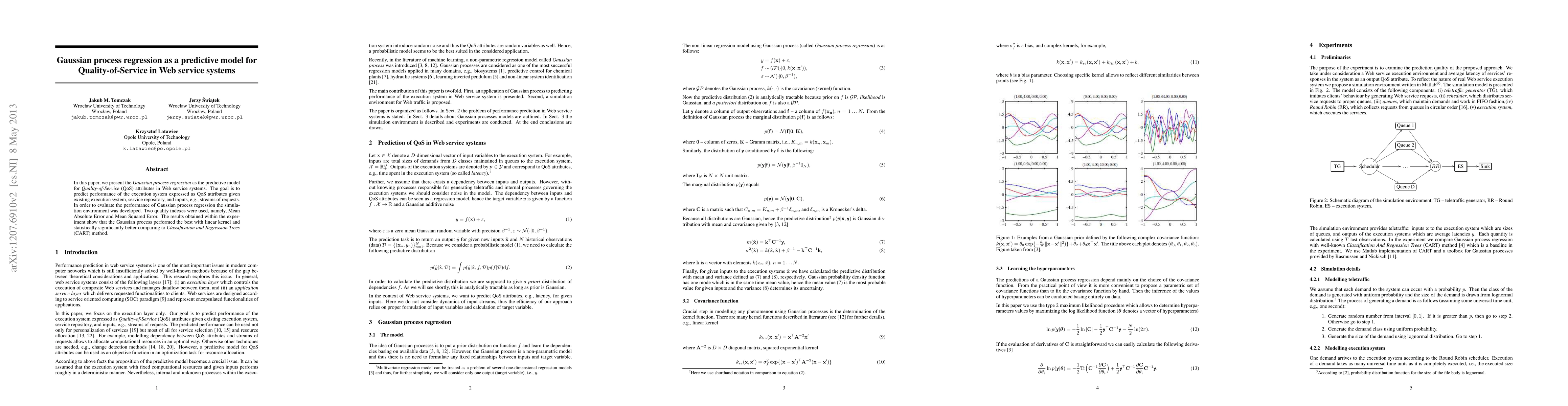 This paper proposes Gaussian process regression as a predictive model for Quality-of-Service (QoS) in Web service systems, demonstrating superior performance over Classification and Regression Trees (CART) using Mean Absolute Error and Mean Squared Error as evaluation metrics.