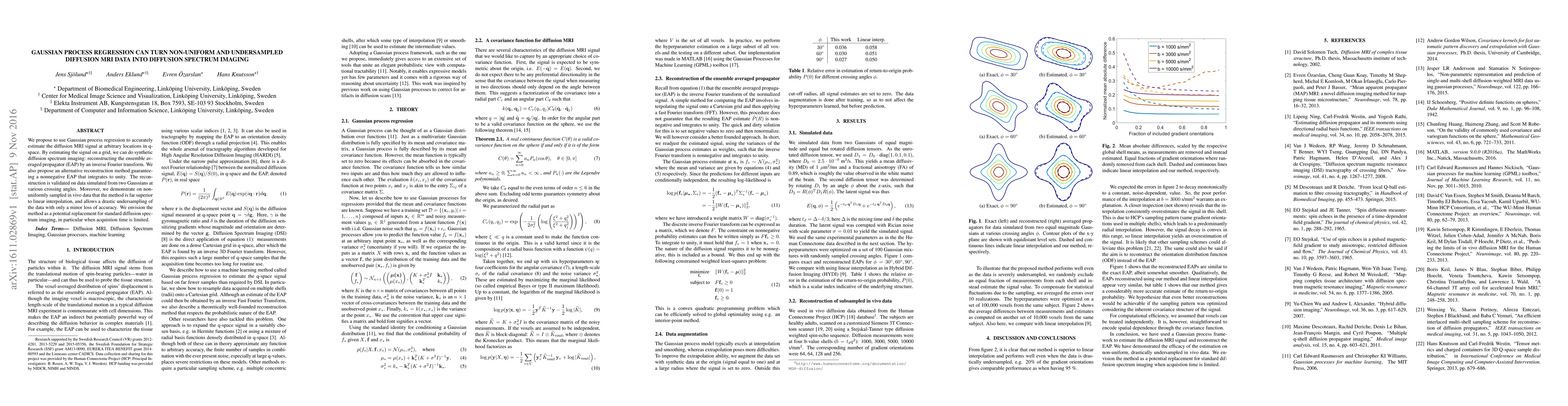 This paper proposes using Gaussian process regression to reconstruct diffusion spectrum imaging from non-uniform and undersampled diffusion MRI data, outperforming linear interpolation and enabling significant data reduction with minimal loss of accuracy. The method is validated on simulated data and in vivo samples.