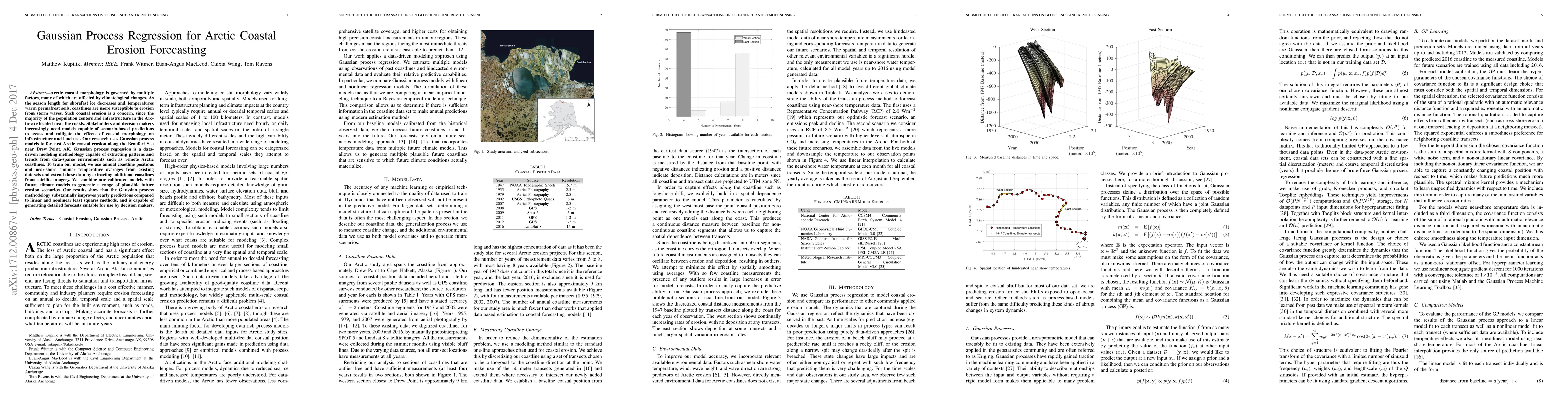 Arctic coastal morphology is governed by multiple factors, many of which are affected by climatological changes. As the season length for shorefast ice decreases and temperatures warm permafrost soils, coastlines are more susceptible to erosion from storm waves. Such coastal erosion is a concern, since the majority of the population centers and infrastructure in the Arctic are located near the coasts. Stakeholders and decision makers increasingly need models capable of scenario-based predictions to assess and mitigate the effects of coastal morphology on infrastructure and land use. Our research uses Gaussian process models to forecast Arctic coastal erosion along the Beaufort Sea near Drew Point, AK. Gaussian process regression is a data-driven modeling methodology capable of extracting patterns and trends from data-sparse environments such as remote Arctic coastlines. To train our model, we use annual coastline positions and near-shore summer temperature averages from existing datasets and extend these data by extracting additional coastlines from satellite imagery. We combine our calibrated models with future climate models to generate a range of plausible future erosion scenarios. Our results show that the Gaussian process methodology substantially improves yearly predictions compared to linear and nonlinear least squares methods, and is capable of generating detailed forecasts suitable for use by decision makers.
