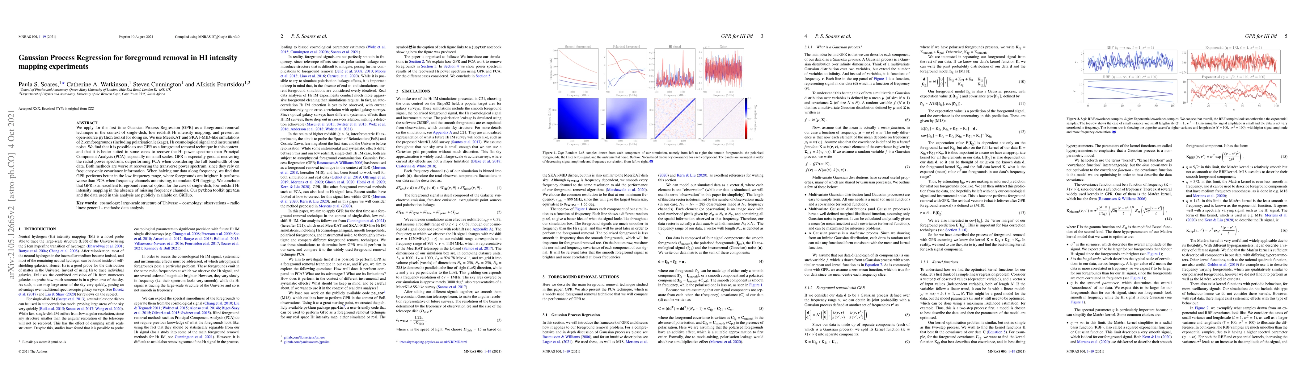 We apply for the first time Gaussian Process Regression (GPR) as a foreground removal technique in the context of single-dish, low redshift HI intensity mapping, and present an open-source Python toolkit for doing so. We use MeerKAT and SKA1-MID-like simulations of 21cm foregrounds (including polarisation leakage), HI cosmological signal and instrumental noise. We find that it is possible to use GPR as a foreground removal technique in this context, and that it is better suited in some cases to recover the HI power spectrum than Principal Component Analysis (PCA), especially on small scales. GPR is especially good at recovering the radial power spectrum, outperforming PCA when considering the full bandwidth of our data. Both methods are worse at recovering the transverse power spectrum, since they rely on frequency-only covariance information. When halving our data along frequency, we find that GPR performs better in the low frequency range, where foregrounds are brighter. It performs worse than PCA when frequency channels are missing, to emulate RFI flagging. We conclude that GPR is an excellent foreground removal option for the case of single-dish, low redshift HI intensity mapping in the absence of missing frequency channels. Our Python toolkit gpr4im and the data used in this analysis are publicly available on GitHub.