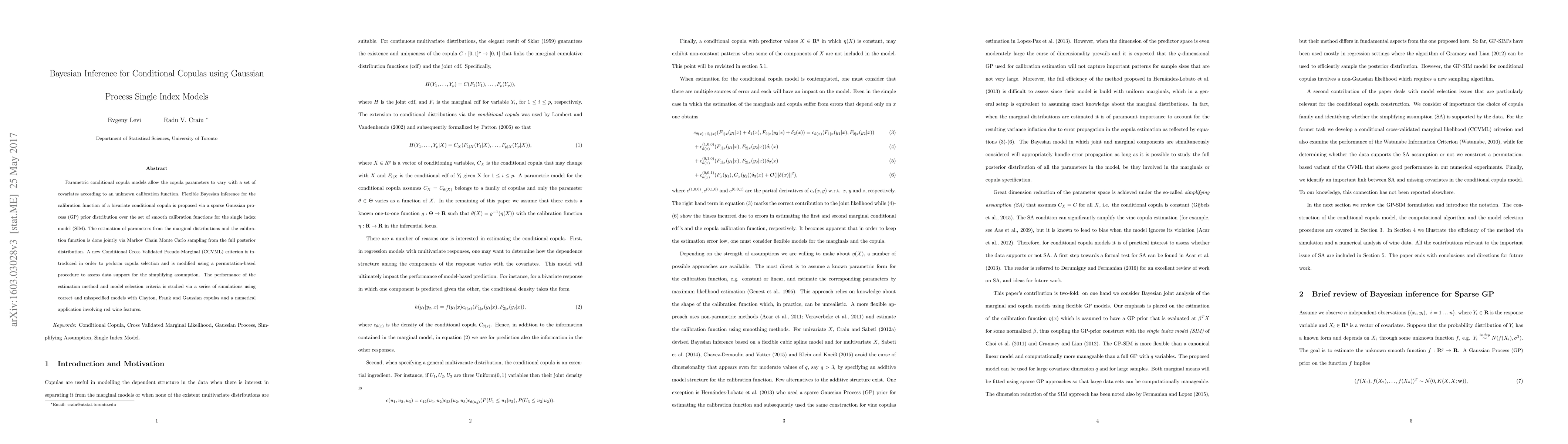 This paper proposes a Bayesian approach using Gaussian Process Single Index Models for estimating parametric conditional copulas, employing Markov Chain Monte Carlo for parameter estimation and a new CCVML criterion for model selection, validated through simulations and a case study on red wine features.
