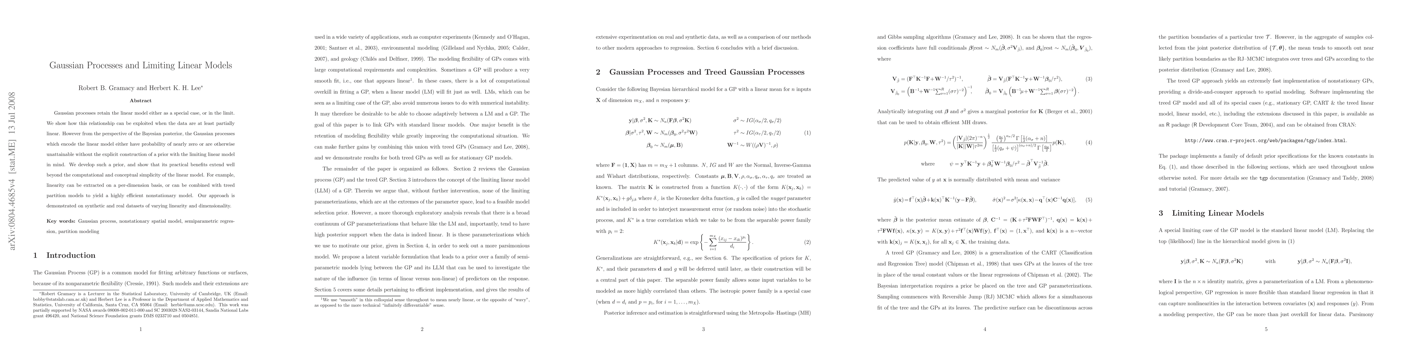 Gaussian processes retain the linear model either as a special case, or in the limit. We show how this relationship can be exploited when the data are at least partially linear. However from the perspective of the Bayesian posterior, the Gaussian processes which encode the linear model either have probability of nearly zero or are otherwise unattainable without the explicit construction of a prior with the limiting linear model in mind. We develop such a prior, and show that its practical benefits extend well beyond the computational and conceptual simplicity of the linear model. For example, linearity can be extracted on a per-dimension basis, or can be combined with treed partition models to yield a highly efficient nonstationary model. Our approach is demonstrated on synthetic and real datasets of varying linearity and dimensionality.